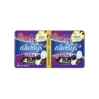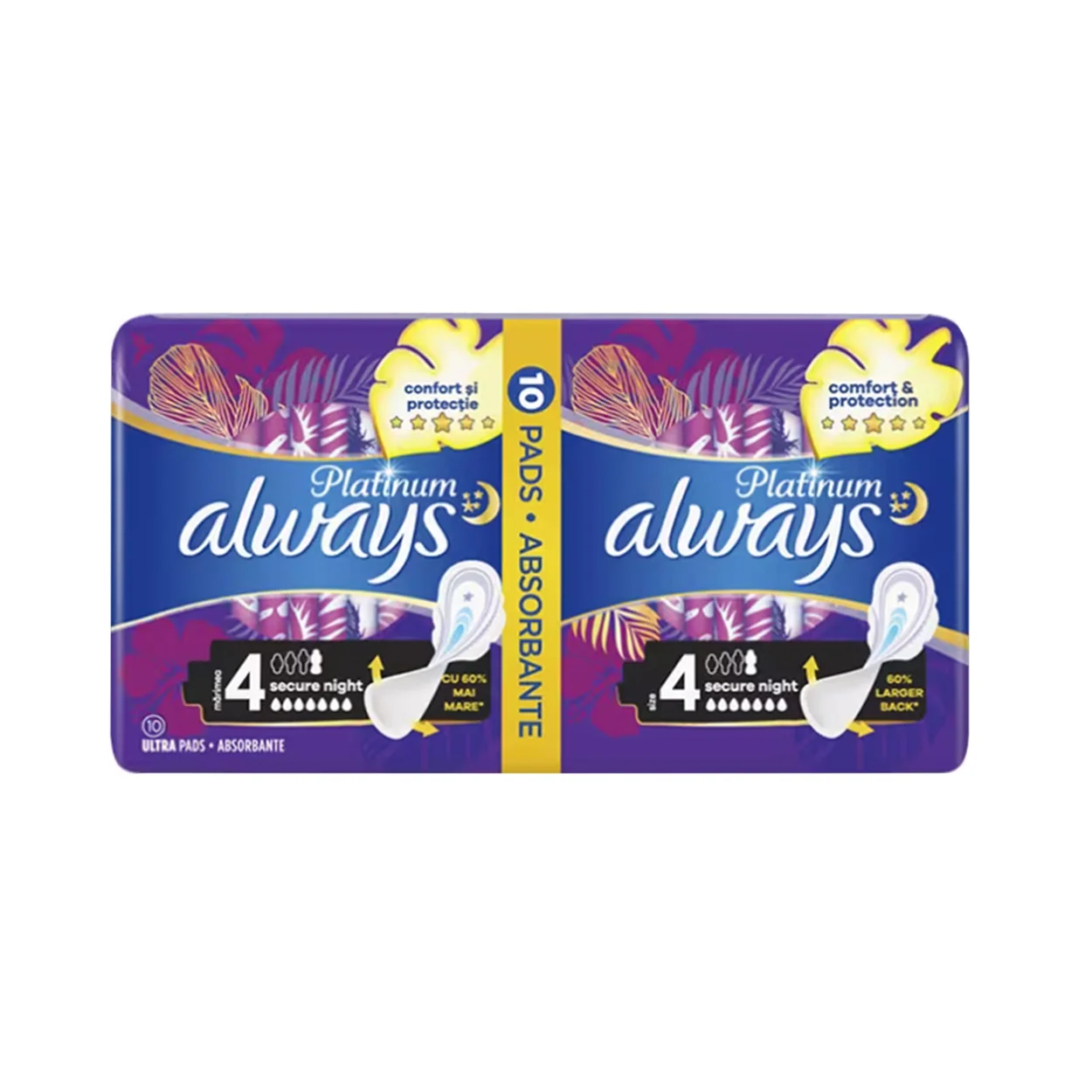 Absorbantele Always Platinum Ultra Secure Night marimea 4 in cantitate de 10 bucati sunt mult mai confortabile si moi, oferind mai multa protectie pe timpul noptii. Acest lucru este posibili multumita miilor de pernute microscopice si insertii intarite care au rolul de a actiona ca o bariera puternic absorbanta chiar si pe laterale. In plus, dispun si de o tehnologie noua care si neutralizeaza orice fel de miros nedorit. Absorbantele de noapte Always Platinum Ultra Night sunt mult mai groase decat cele obisnuite (3 mm) asigurand protectie si confort pe tot parcursul ciclului de menstruatie, in special pe timpul noptii.