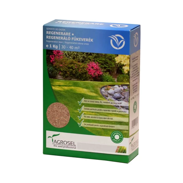 Seminintele de gazon de regenerare marca Agrosel ambalate la cutie de 1 kg sunt un tip special de seminte de iarba utilizate in mod special pentru refacerea si reinnoirea suprafetelor de gazon deteriorate sau slabe. Aceste seminte regenerare gazon au caracteristici superioare de rezistenta, cum ar fi: la trafic intens, toleranta la seceta, rezistenta la boli si buruieni, asigurand o capacitate rapida de dezvoltare. Semintele pentru regenerarea gazonului la 1 kg poate acoperi o suprafata maxima de 40 metri patrati.