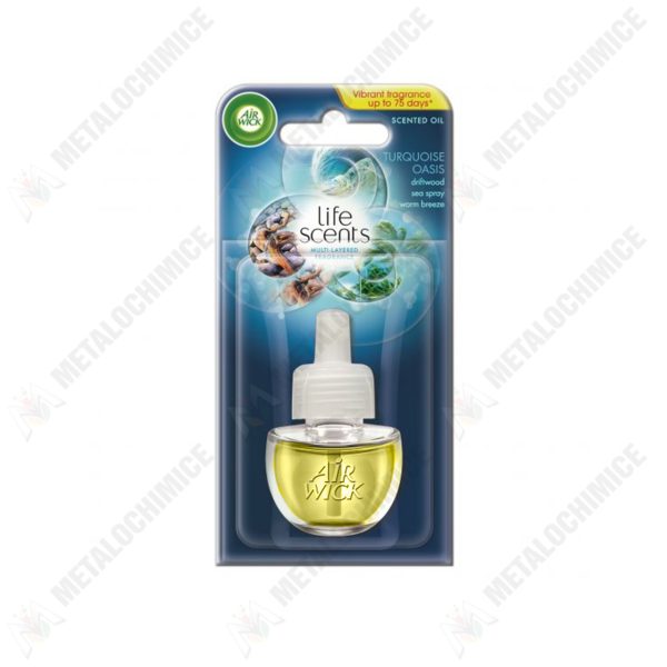 Rezerva AirWick Life scents cu parfum denumit Turquoise oasis combinat cu driftwood, seaspray si warm breeze este in cantitate de 20 ml pentru 100 de zile de miresme placute, relaxante si pline de prospetime. Rezerva odorizanta Airwick Life scents va inlatura orice miros neprielnic si persistent indiferent ca acesta provine din baie, living, dormitoare sau bucatarie, putand fi pozitionat cu usurinta intr-una din aceste incaperi. Multumita ingredientelor atent selectionate si amestecate corespunzator veti transforma caminul dumneavoastra, intr-o oaza de mirosul proaspete si relaxante.