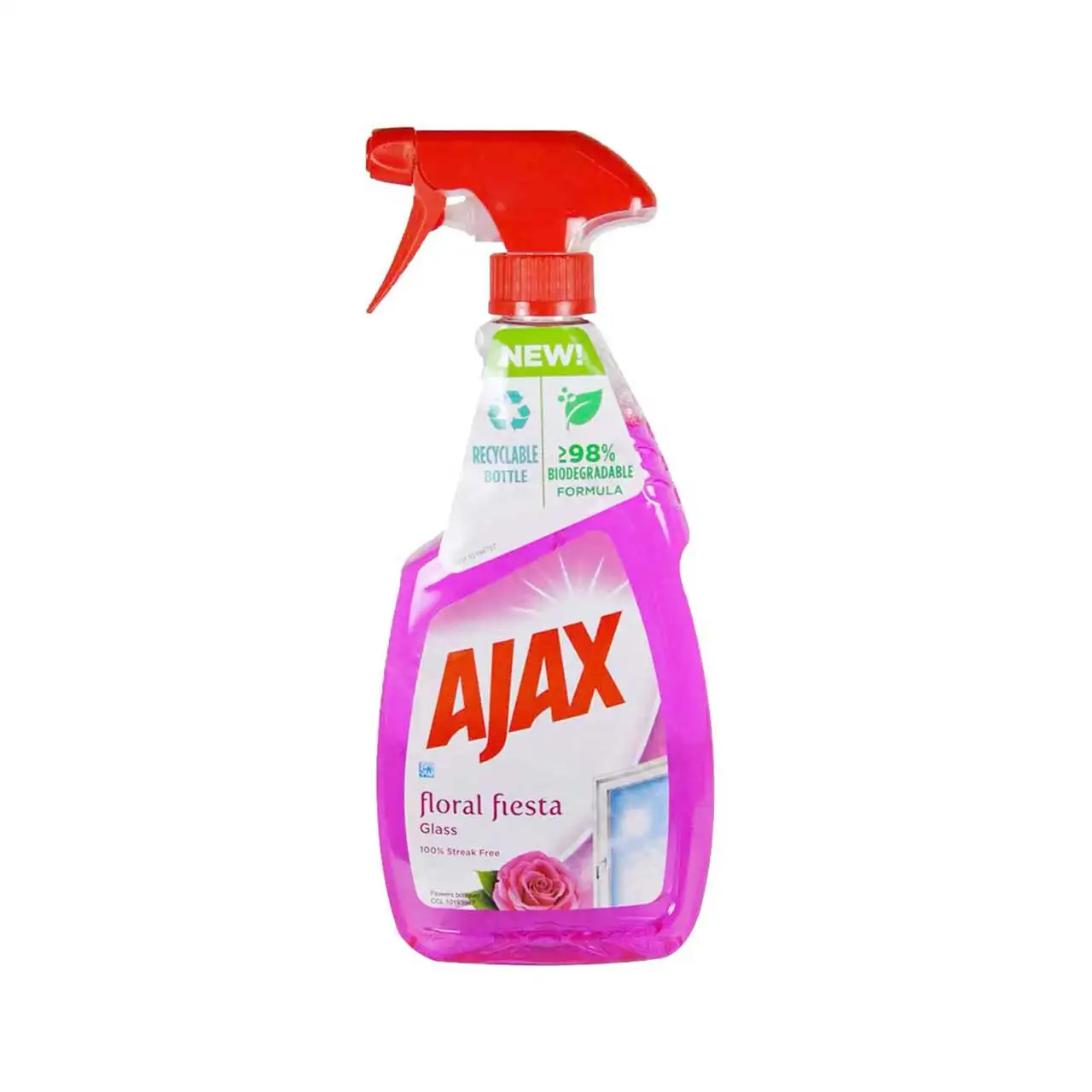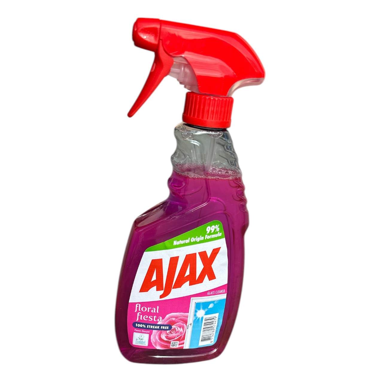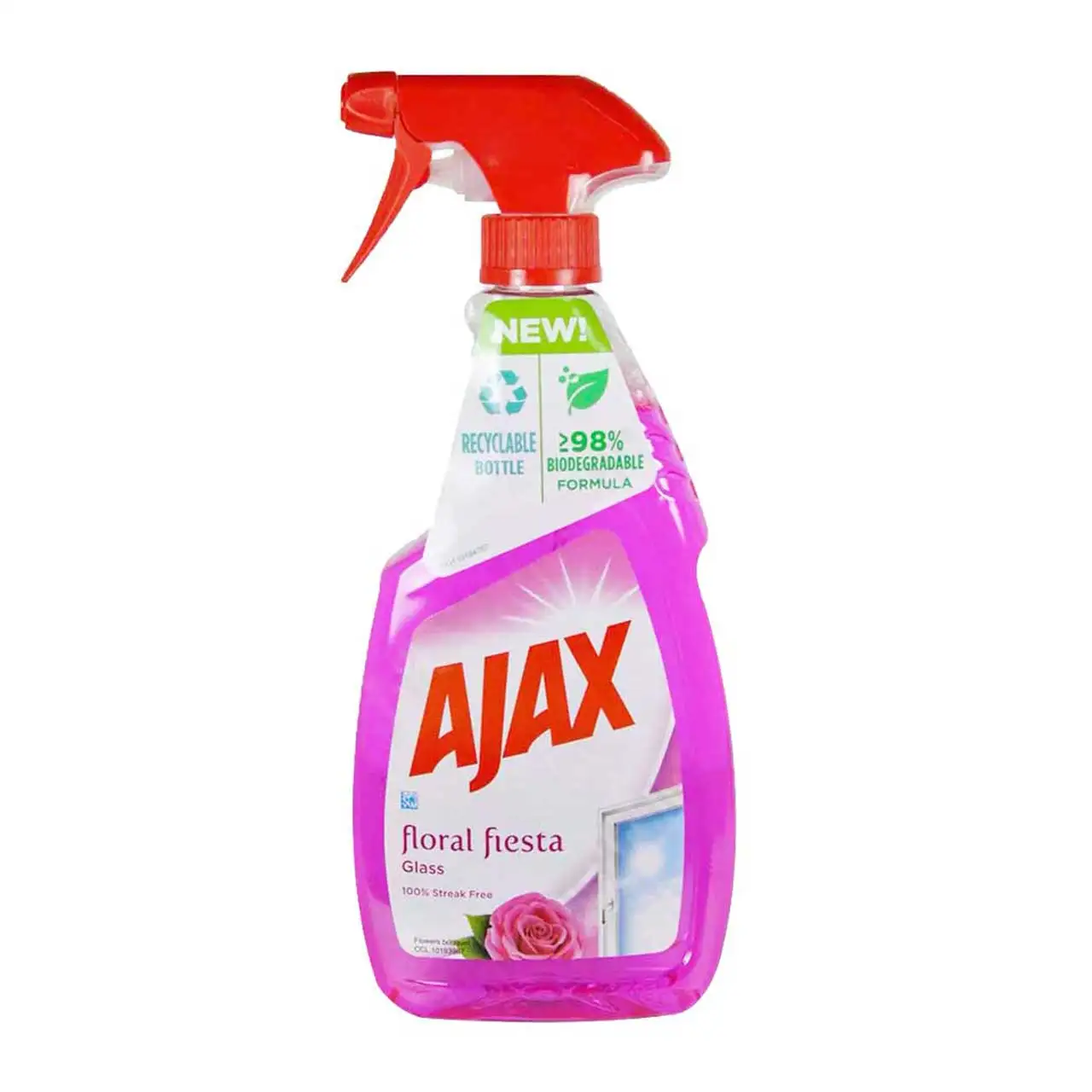 Ajax Floral Fiesta este o solutie de geamuri cu pulverizator, la sticla de 500 ml pentru uz casnic care poate fi folosit cu eficienta pe suprafetele din sticla. Ingredientele bine alese, formeaza o formula puternica ce confera stralucire si curatenie sticlei, timp indelungat. Solutia de geamuri Ajax Floral Fiesta indeparteaza toate petele persistente, mirosul nedorit si murdaria, fara sa lase urme. Totodata, cu parfumul sau de buchet floral (flowers bouquet) va improspata aeru o perioada indelungata de timp. Aceasta solutie de geamuri Ajax Floral Fiesta se utilizeaza pe orice fel de geam, oglinda sau suprafata din portelan. Ajax Floral Fiesta este o solutie geamuri lichida de culoare roz ce dizolva usor murdaria, si petele. Se recomanda pulverizarea pe suprafata dorita de la o distanta de aproximativ 20-25 cm.