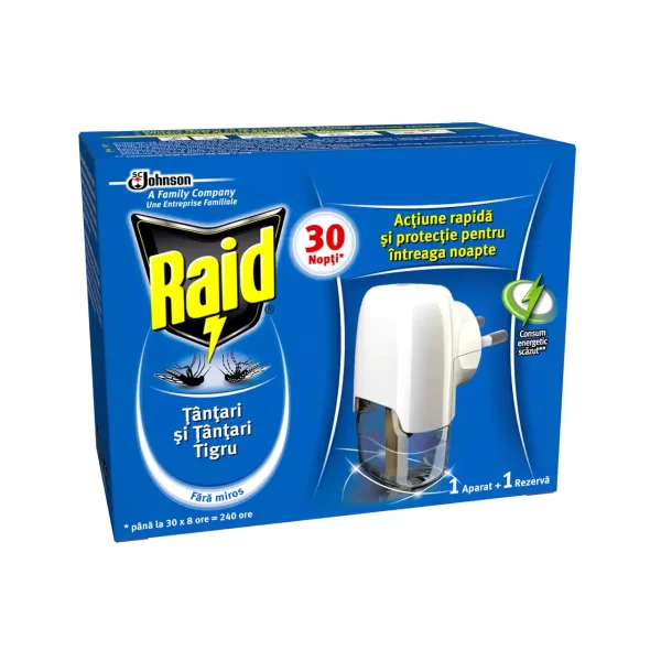 Aparatul anti tantari de la Raid ce functioneaza cu rezerva lichida, protejeaza casa impotriva tantarilor si tantarilor tigru pe o perioada lunga de timp. Aparatul electric Raid are in interiorul lui o rezerva cu solutie antitantari ce nu are miros si protejeaza casa pana la 240 de ore.Aparat anti tantari Raid cu rezerva lichida asigura o protectie constanta de 8 ore pe noapte impotriva tantarilor normali, dar si impotriva tantarilor tigru.