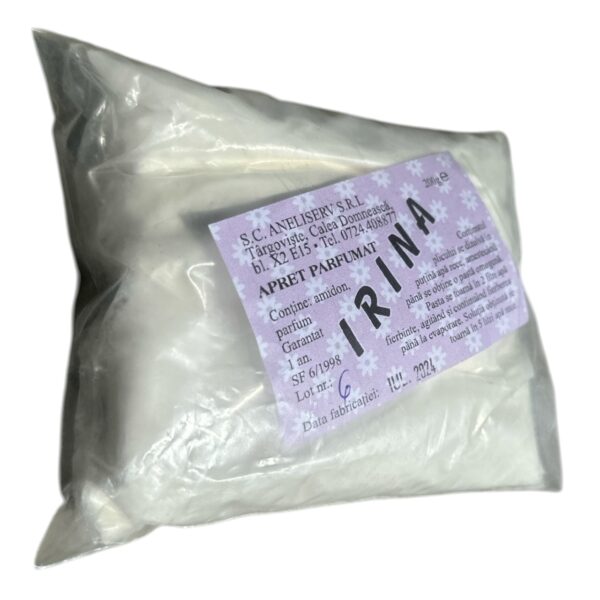 Apretul praf la 150g pentru haine (rufe) fabricat din amidon de porumb este un produs excelent pentru utilizarea sa pe majoritatea tipurilor de material textil, atat naturale (bumbac, matase) cat si sintetice, intrucat nu deterioreaza tesaturile. Apretul de rufe tip praf este usor de utilizat, nu trebuie decat sa adaugati 2 linguri intr-un pahar cu apa rece, amestecandu-se riguros pana se omogenizeaza compret. Compozitia obtinuta se toarna apoi in 2 litri de apa fierbinte si se amesteca bine. Dupa primul clocot se ia vasul de pe foc iar continutul se toarna peste circa 3 litri de apa rece. La nevoie se strecoara. Cantitatea de apret obtinuta este suficienta pentru circa 5 kg de rufe.