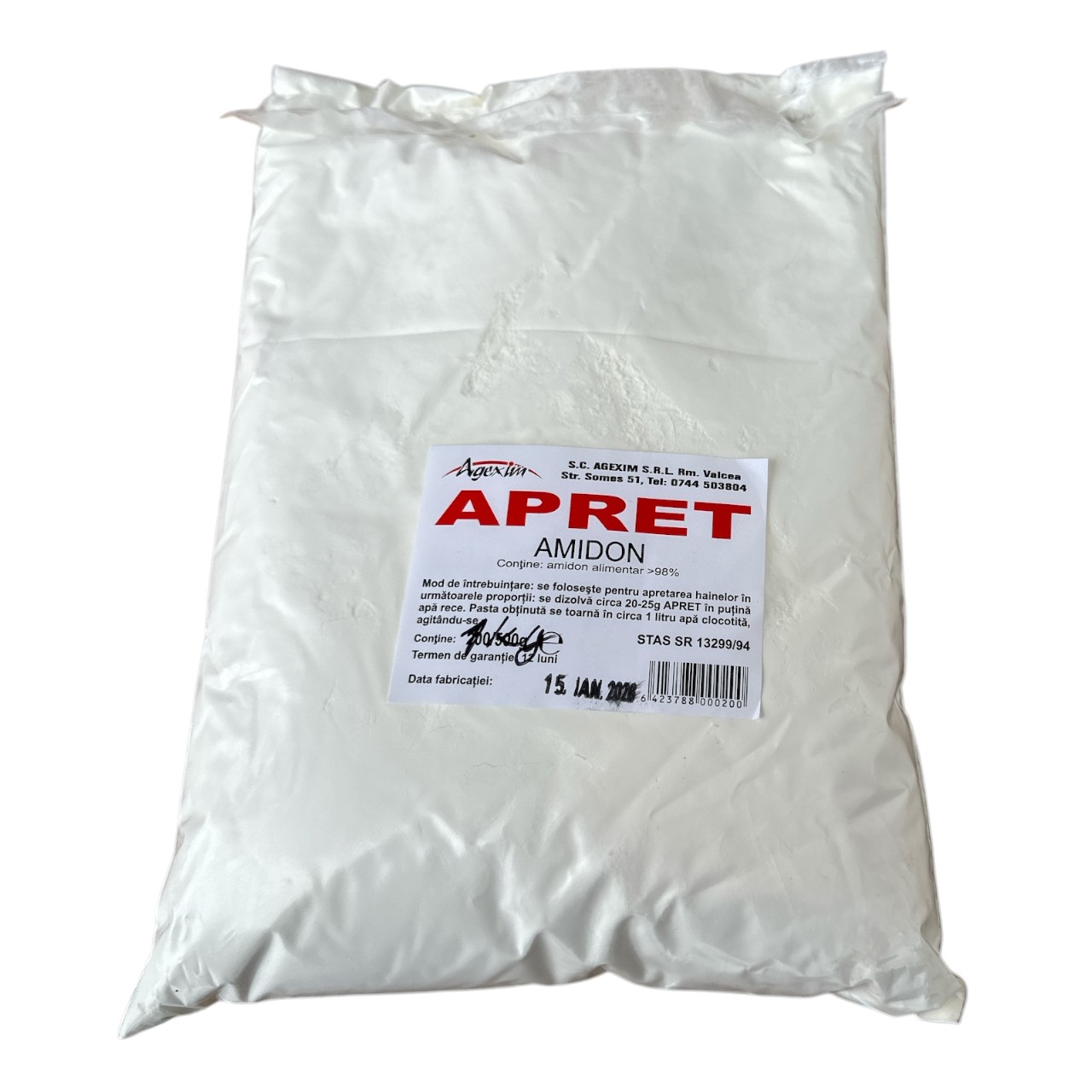 Apret rufe din amidon alimentar praf la punga de 1 kg este un produs folosit la apretarea hainelor, potrivit pentru utilizarea sa pe o varietate de materiale textile, inclusiv bumbac si matase, dar si materiale sintetice, fara sa deterioreze tesaturile. Utilizarea acestui apret rufe din amidon alimentar se face in urmatorul fel: adaugati doar 2 lingurite intr-un pahar cu apa rece si amestecati energic pana cand se obtine o compozitie omogena. Apoi, turnati aceasta compozitie in 2 litri de apa fierbinte si amestecati bine. Dupa ce amestecul ajunge la punctul de fierbere, indepartati vasul de pe foc si turnati-l peste aproximativ 3 litri de apa rece. La nevoie, puteti strecura amestecul. Cantitatea de apret obtinuta este suficienta pentru aproximativ 5 kg de rufe. Apretul din amidon alimentar tip praf va asigura hainelor dumneavoastra o rezistenta mai buna impotriva cutelor / sifonarii, mentinandu-si forma initiala.