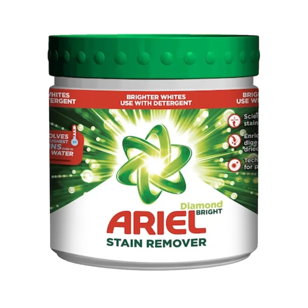 Pudra de scos pete de pe rufele albe Ariel Diamond Bright la 500 grame este o pudra special conceputa pentru inalturarea tuturor petelor, oferindu-va o solutie eficienta pentru mentinerea albului imaculat al hainelor dumneavoastra preferate. Aceasta pudra Ariel pete contine agenti tensioactivi si enzime foarte puternice care sunt eficiente in eliminarea celor mai grele petelor de pe haine. Indiferent ca sunt pete de grasime, mancare, sucuri, cafea, iarba sau alte substante, acest produs le va elimina eficient.