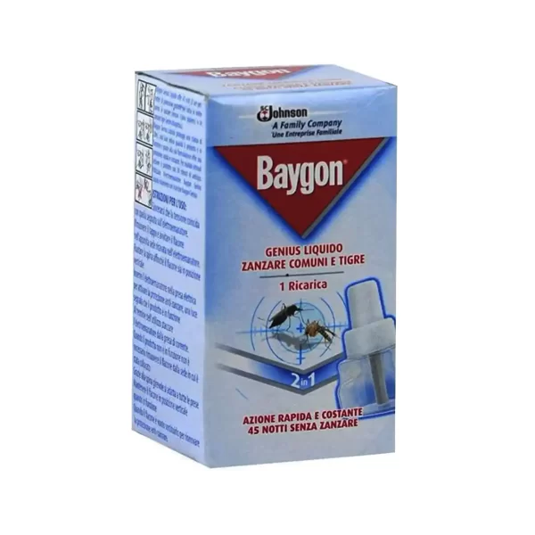 Rezerva lichida Baygon pentru aparatul electric in cantitate de 27 ml ce actioneaza timp de 45 de nopti (8 ore pe noapte) pentru o protectie dovedita impotriva tantarilor comuni cat si cei trigru, chiar si cu fereastra usor deschisa si luminile aprinse. Lichidul din rezerva este inodor, nu este toxic si poate fi utilizata fara probleme si in camera copiilor.