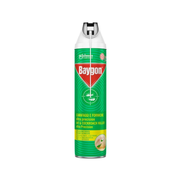 Baygon Spray gandaci si furnici cu extra precizie 400 ml dispune de o formula super eficienta capabila sa actioneze extrem de rapid impotriva furnicilor si gandacilor, creand in acelasi timp, o bariera de protectie ce dupreaza pana la 4 saptamani. Spray-ul Baygon dispune de un aplicator alungit si subtire tip pai ce va da voie aplicarea in locuri extrem de greu accesibile, cum ar fi: crapaturi in pereti, pe langa cadre din lemn, sub diverse obiecte mari, etc.