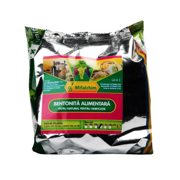 Bentonita alimentara este un filtru natural pentru vinificatie in cantitate de 50 g, marca Mifalchim ce se utilizeaza la tratamentul vinului dupa ce a fermentat compet si a fost tras de pe drojdie. Bentonita alimentara se aplica in doza de 1 kg la 1000 de litri in cazul vinului rosu, iar pentru cel alb cantitatea se dubleaza 2 kg la 1000L. De asemenea, Bentonita alimentara se aplica dupa ce vinul a fiert, iar temperatura sa este de minim 16 grade.