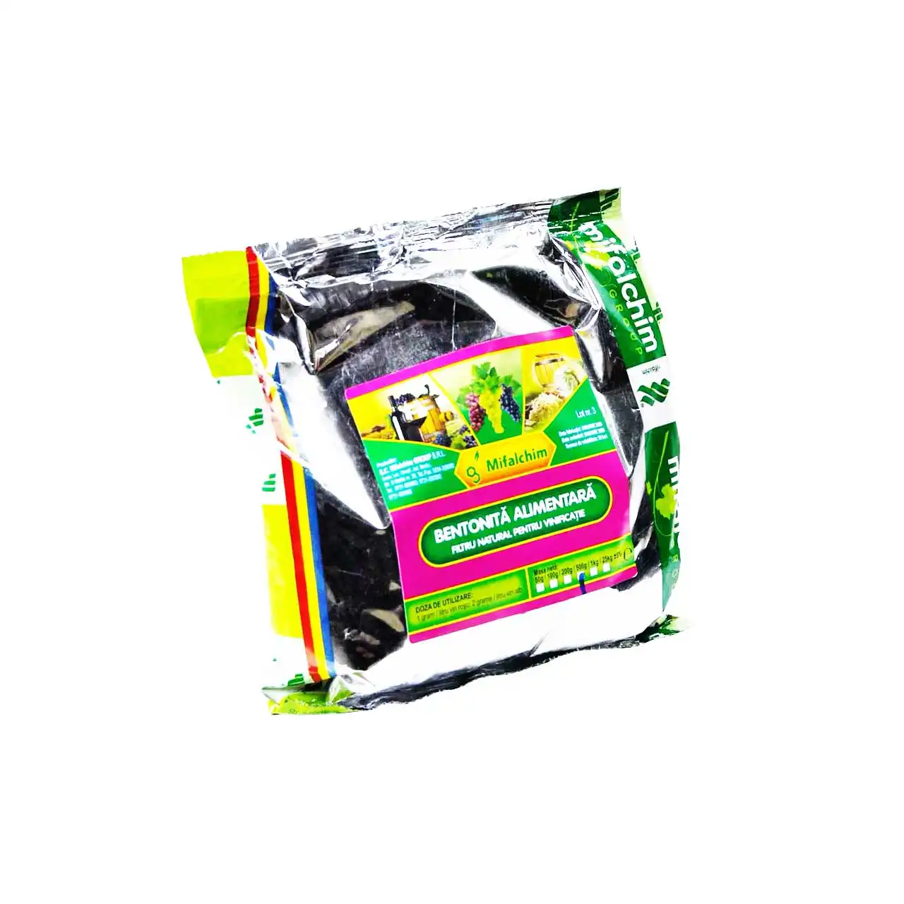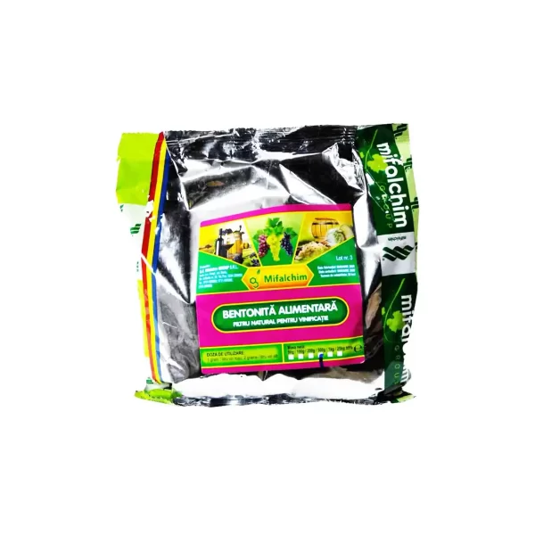 Bentonita alimentara pentru limpezirea vinului sub forma de pulbere in cantitate de 500 g este obtinuta din roca argiloasa numita bentonit [(Na,Ca)0,3(Al,Mg)2Si4O10(OH)2·nH2O] care se formeaza prin dezagregarea tufurilor vulcanice. Bentonita pentru limpezirea vinului reprezinta un pas important pentru realizarea calitativa a vinului rosu (rose) sau alb. Procesul de limpezire mai este cunoscut si ca decantare si are scopul de a elimina sedimentele din vin si microorganismele. Bentonita este o substanta cleitoare capabila sa absorba proteinele datorita faptului ca are sarcini electrice negative fara de cele pozitive ale proteinelor. In plus, bentonita alimentara impreuna cu un dioxid de sulf stabilizeaza, nu permite otetirea si imbunatateste aroma si gustul. Procesul de bentonizare se face prin dizolvarea bentonitei in cca. 900 ml de apa, amestecandu-se continuu pana se omogenizeaza si se lasa 24 de ore pentru asi crea sarcinile electrice.