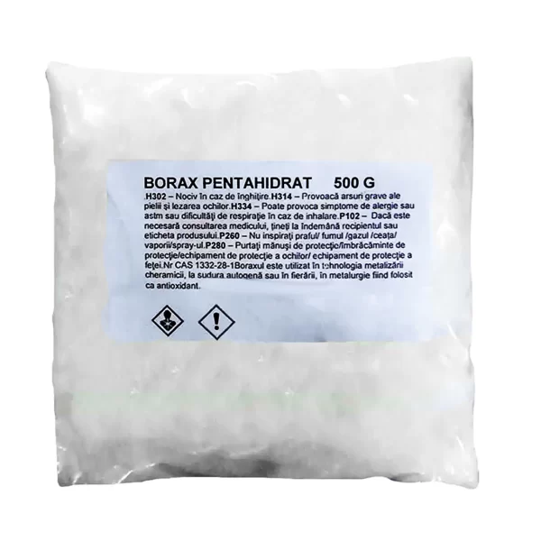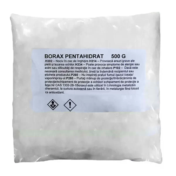 Boraxul pentahidrat (tetraborat de sodiu) sub forma de pudra, ambalat la punga de 500 de grame avand formula chimica Na2[B4O5(OH)4 · 8 H2O este un mineral natural inodor si incolor din clasa boratilor, cunoscut si ca borat de sodiu, tetraborat de sodiu sau diborat de natriu decahidrat. Denumit si sarea acidului boric, se regaseste cel mai des in mod natural in Tibet, California sau Turcia.