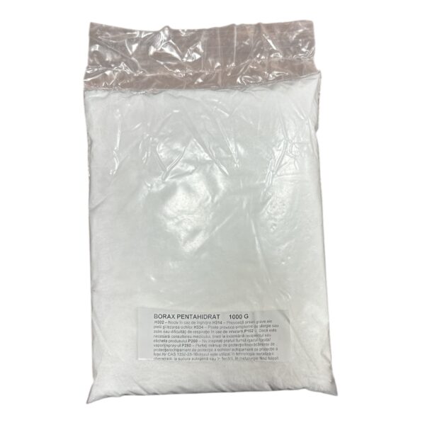 BORAX (tetraborat de sodiu) pentahidrat cu fromula chimica Na2[B4O5(OH)4 · 8 H2O cunoscut si ca (borat de sodiu) este un produs sub forma de pudra, ambalat intr-o punga de 1 kg. Este un compus chimic utilizat in diverse aplicatii, datorita proprietatilor sale versatile si beneficiilor pe care le ofera. Cunoscut pentru proprietatile sale de curatare si dezinfectare, poate fi utilizata in diverse activitati de curatenie si igiena, contribuind la indepartarea murdariei, petelor si mirosurilor neplacute. Este eficient in curatarea suprafetelor, a obiectelor casnice si a tesaturilor. De asemenea, este utilizat in fabricarea produselor cosmetice si de ingrijire personala, poate fi adaugat in compozitia sapunurilor, a samponelor si a altor produse pentru par si piele, datorita proprietatilor sale de a mentine echilibrul pH-ului si de a conferi stralucire si volum.