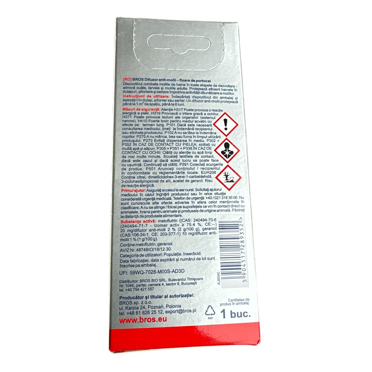 Bros Difuzor anti-molii cu parfum de flori de portocal este un dispozitiv conceput pentru a proteja hainele si textilele impotriva daunatorilor, in special impotriva molilor. Acesta este alcatuit dintr-un suport de carton cu carlig de agatat, care contine un amestec de substante active, printre care uleiuri esentiale naturale, care resping moliile. Acest difuzor anti-molii functioneaza prin vaporizarea treptata a substantelor active in mediul inconjurator, astfel incat acestea sa ajunga in fiecare colt al dulapului sau al sifonierului in care este amplasat.