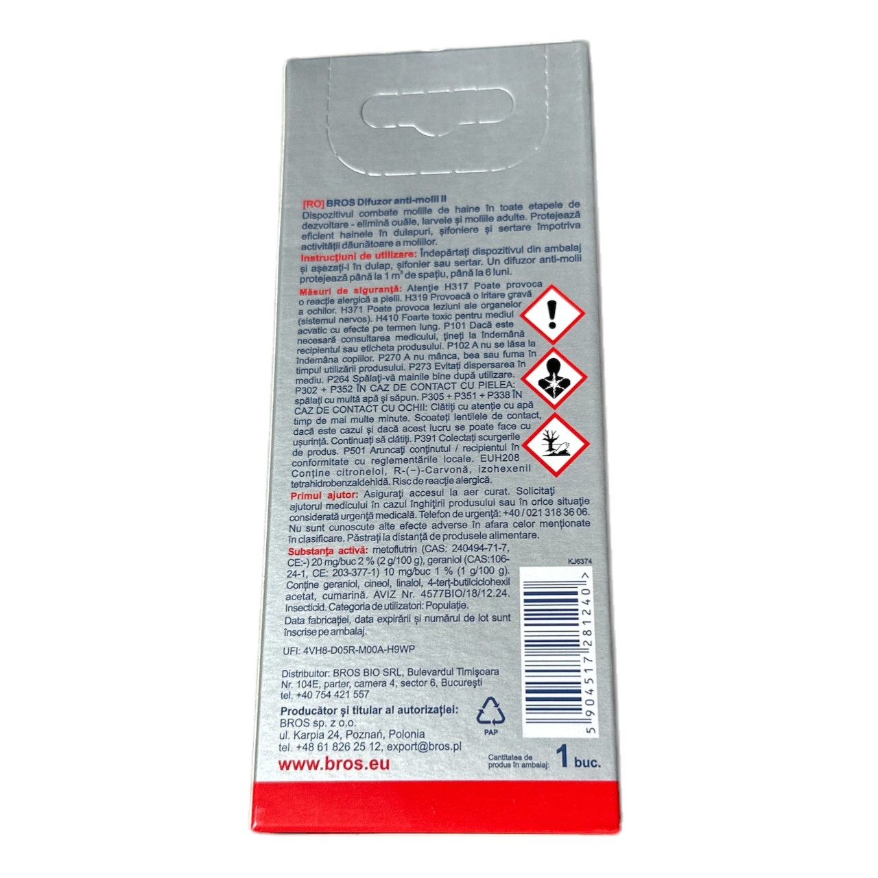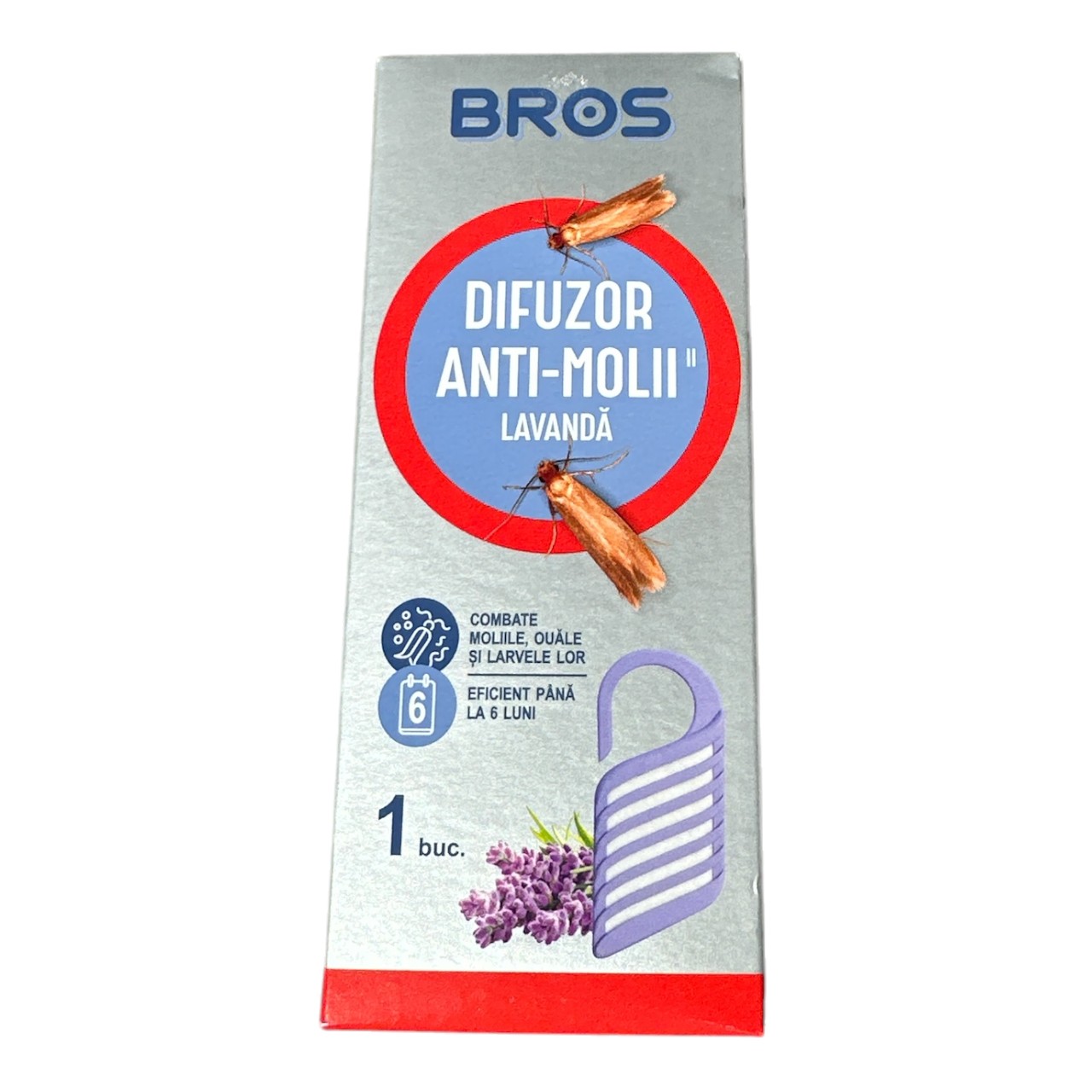 Bros Suport de agatat antimolii, Difuzor Lavanda este un produs conceput sa protejeze si sa elimine moliile din dulapul cu haine sau din debarale, fara sa lase urme sau sa pateze textilele, lasand in urma sa un miros placut parfumat. Acesta este adesea folosit nu doar in dulapuri, ci si in sertare si spatii in care se depoziteaza hainele de sezon.