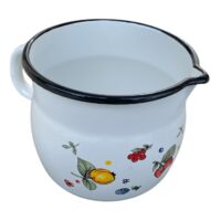Cana bombata emailata 1.5 litri realizata din material otel, supus tratamentului de emailare in cuptor. Emailul ofera protectie superioara otelului de coroziune, este antibacterian si este extrem de rezistent in timp (pana la 30 de ani). Cana bombata emailata 1.5 litri este foarte utila pentru incalzirea mancarii sau diverselor lichide, indiferent ca este afara direct pe carbuni incinsi, pe aragaz la flacara sau pe plita prin inductie. Cana emailata este cea mai buna alegere pentru bucataria dumneavoastra.