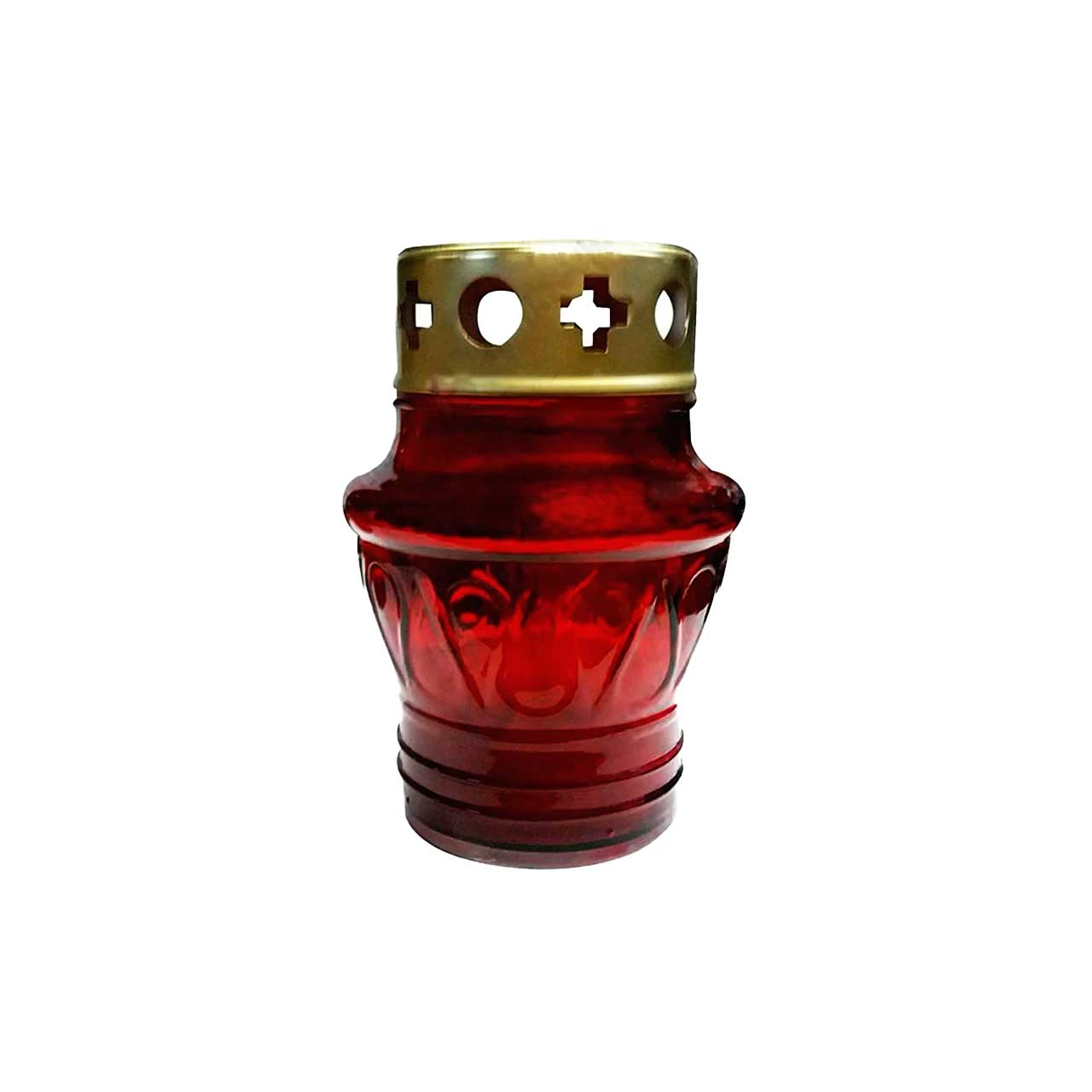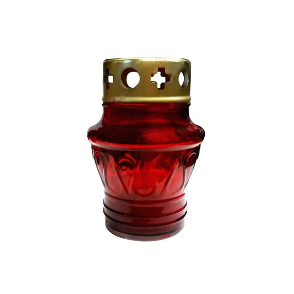 Candela din sticla cu capac metalic de 11 cm este un accesoriu religios special pentru sarbatori sau slujbe. Peretii candelei sunt realizati din sticla iar pe interior se afla o lumanare groasa prevazuta cu fitil de aprindere. La suprafata are un capac din metal subtire cu orificii laterale in forma de cerc si cruce pentru eliberarea caldurii provocate de lumanare. Lumanarea este confectionata din parafina solida de forma cilindrica si in centru se afla un fitil. Se foloseste des ca lumanare pentru doliu, botez, diverse sarbatori religioase, etc. Multumita suportului, lumanarea nu se va stinge nici macar atunci cand vantul bate puternic.