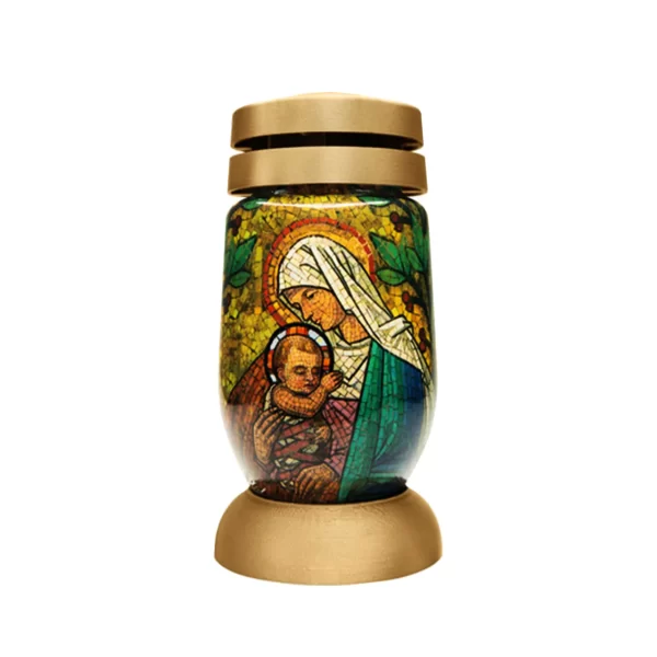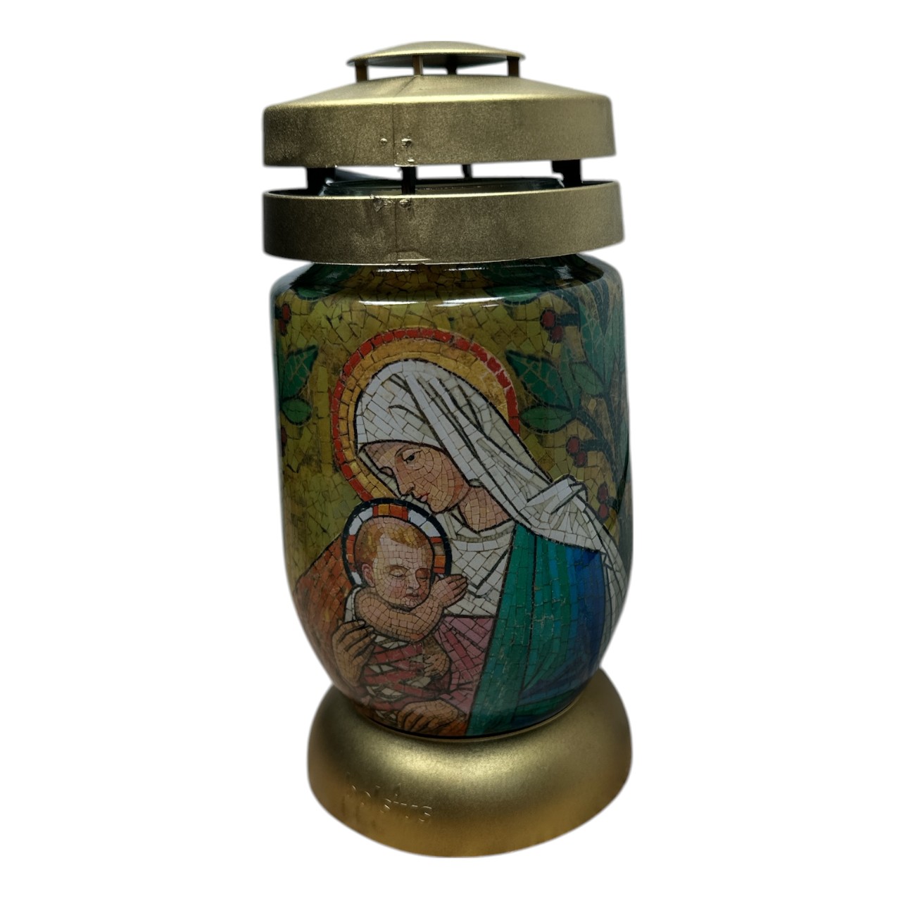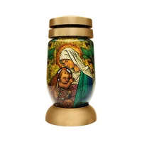 Candela sticla cu lumanare, modelata cu Maica Domnului are inalitmea de 21 cm si este confectionata din sticla plina avand pe interior o lumanare obtinuta din parafina cu un timp de ardere de 36 de ore. Modelul Maica Domnului de pe candela, este reprezentat printr-un design elaborat, realizat în stilul vitraliilor, cu bucati de sticla colorata aranjate direct pe candela. In momentul in care lumanarea este aprinsa, lumina calda va reflecta modelul din vitraliu cu Maica Domnului creand o atmosfera deosebita si spiritualitate. Candela Maica Domnului este des utilizata in biserica si alte lacasuri de cult pentru crearea unei atmosfere spirituale, adaugand solemnitate in timpul slujbelor religioase. Totodata, aceasta este excelenta in timpul sarbatorii pascale pentru sarbatorirea intr-un mod traditional, Invierea Domnului Isus Hristos.