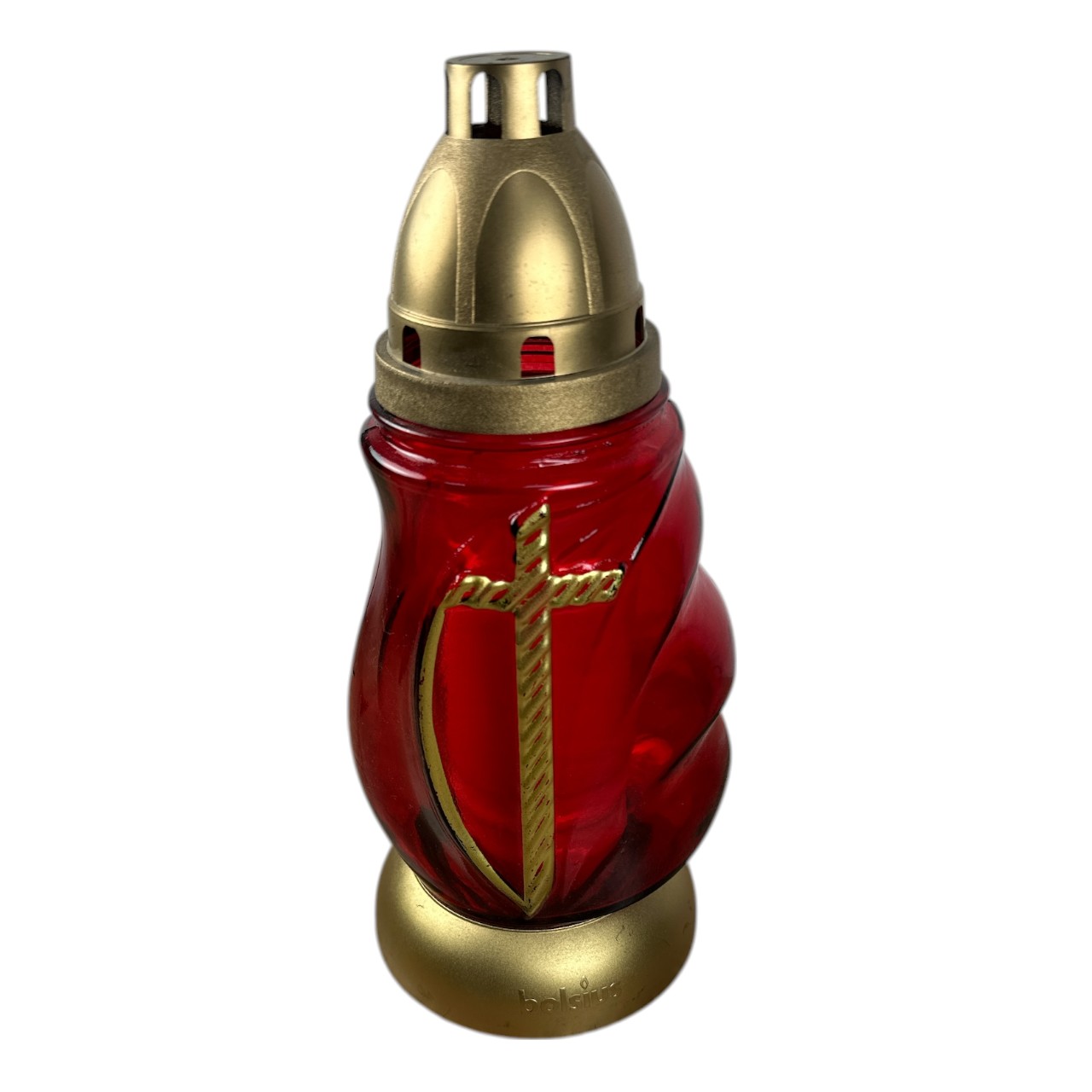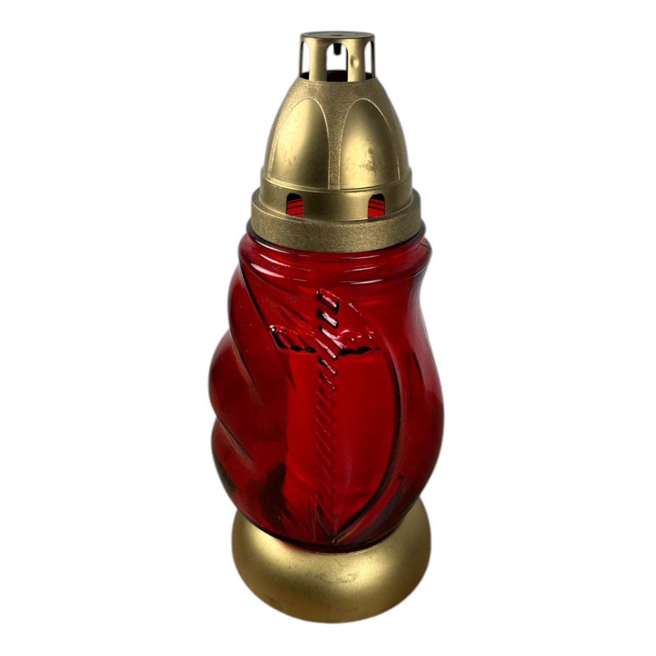 Candela din sticla rosie cu model cruce si o greutate de 490 grame este un obiect creat in mod special pentru sarbatori pascale, slujbe religioase sau pomeni. Candela de sticla are in interiorul ei o lumanare din parafina dispune de capac din plastic si baza invaluita intr-un plastic durificat. Mai mult decat atat, este decorata placut pe exterior cu o cruce galbena (golden) iar pe una din laterale, sticla are cateva ondulari, adaugand un plus de design. Candela sticla cu model cruce de culoare rosie are rolul de a mentine flacara lumanarii in permanenta aprinsa, intrucat o fereste de stropii de apa, vant puternic si alte conditii climatice nefavorabile.