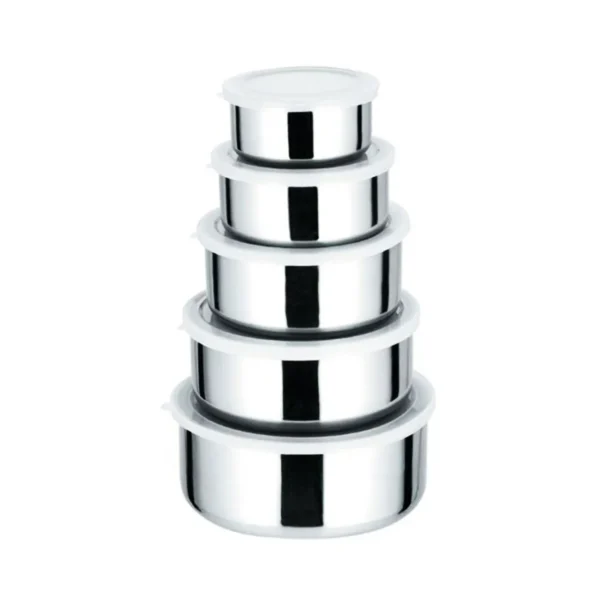 Caserole inox cu capac, ermetice, in set de 5 bucati, sunt recipiente de calitate superioara si functionalitate pentru bucataria ta. Multumita faptului ca sunt fabricate din inox, aceste caserole ermetice ofera un mediu sigur si 100% sigilat pentru depozitarea mancarii proaspat preparate, gustarilor reci, fructelor taiate si multor alte alimente. Fiecare caserola este prevazuta cu un capac ermetic, care asigura etanseitatea, prelungind timpul in care produsele raman proaspete. Aceasta caracteristica este ideala si pentru evitarea raspandirii morusului sau contaminarii lor cu factori din exterior.