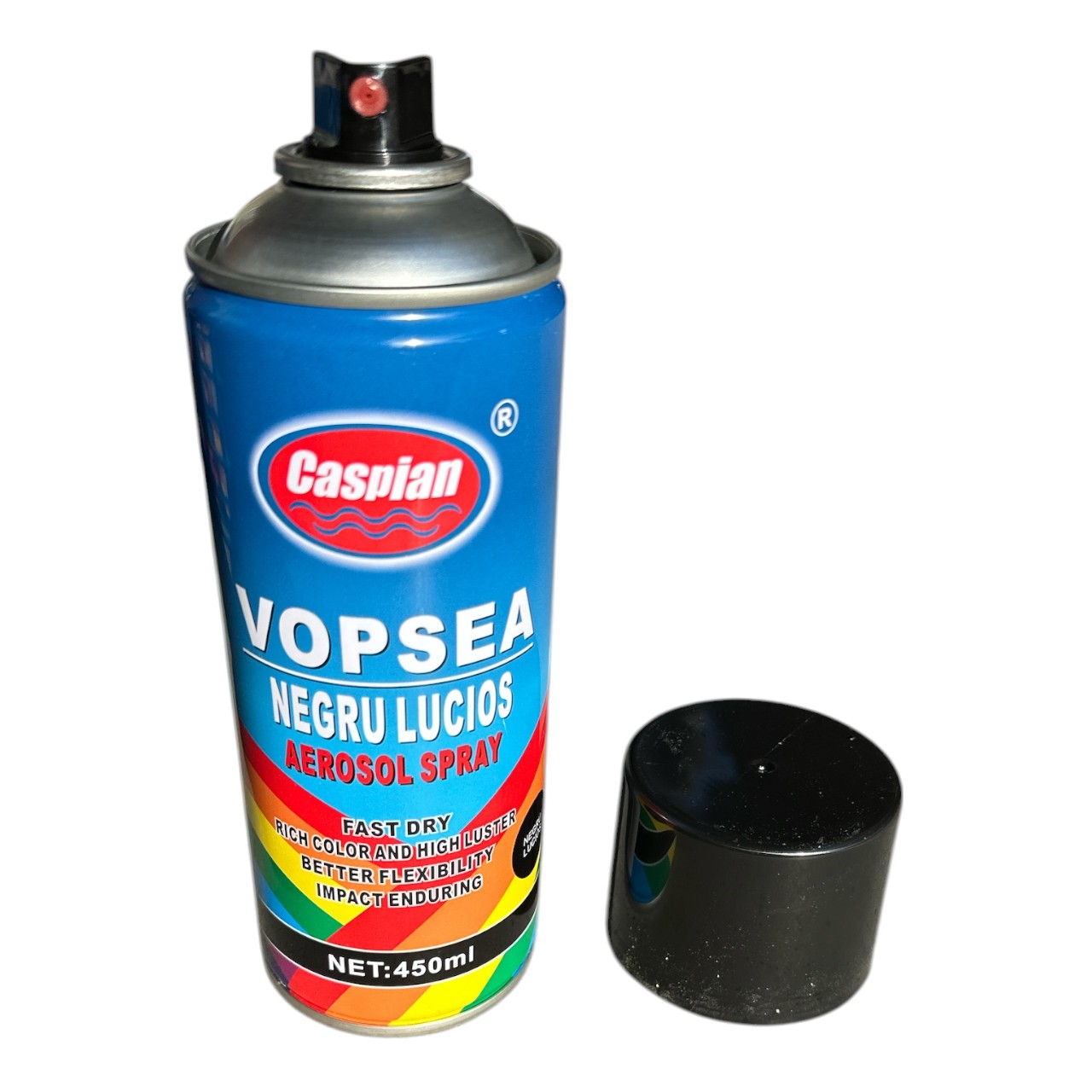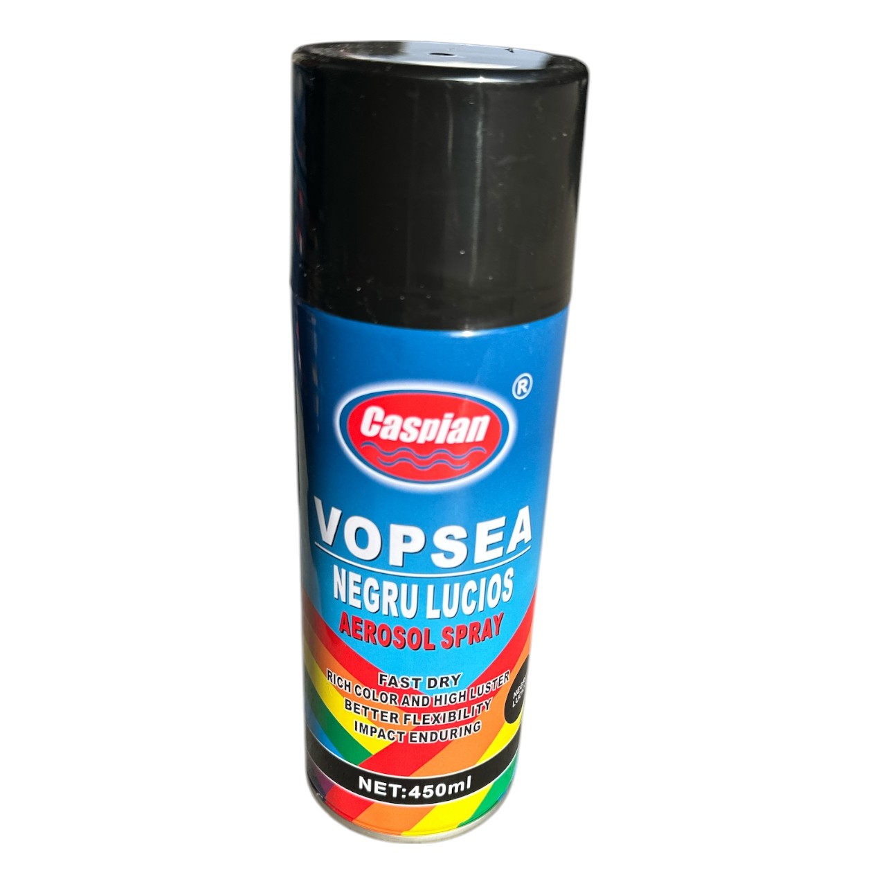 Caspian este o vopsea de culoare neagra lucioasa imbuteliata intr-un recipient tip spray si in cantitate de 0.45L care este utilizata pentru reparatii rapide pe suprafete de lemn, metal, plastic, samd. Vopseaua are la baza productiei tehnici superioare in prelucrarea petrolului ce ajuta sa produca o suprafata uniforma si fina. Spray-ul este de folos pentru retusari in lemn, pentru mici portiuni la frigidere, masini de spalat, motoare auto, caroserie auto, biciclete sau motociclete, sticla piele sau portelan.
