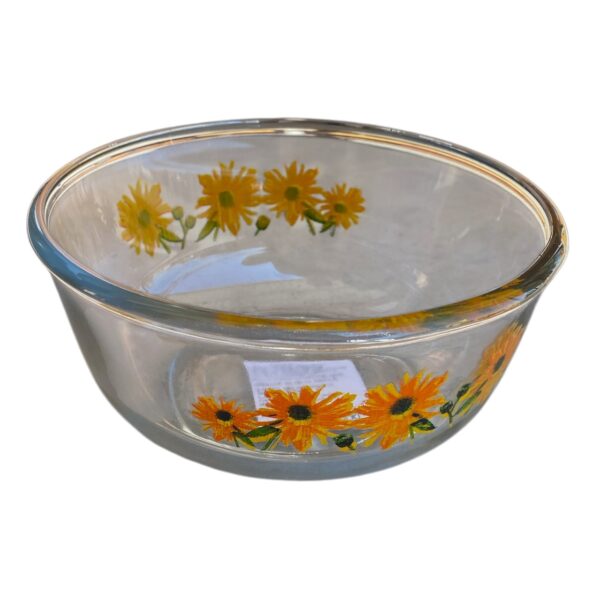 Datorită materialului său durabil și ușor de curățat, castronul asigură o utilizare îndelungată și fără griji. Forma ergonomică și dimensiunile compacte fac acest bol ușor de manevrat și depozitat. Alege acest castron din sticlă transparentă, model floarea-soarelui, de 800 ml pentru a adăuga eleganță și funcționalitate mesei tale. Se poate folosi in masina de spalat vase max 60 grade si in cuptorul cu microunde.