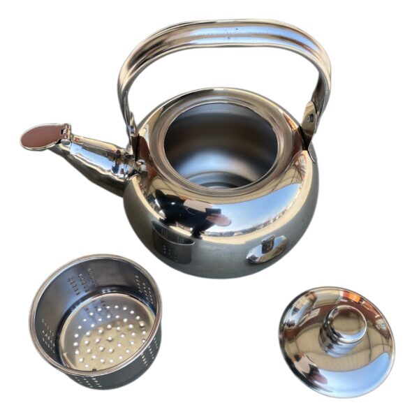 Ceainicul din inox cu infuzor, cu o lungime de 18 cm, este un accesoriu practic si elegant pentru prepararea ceaiului. Fabricat din inox, acest ceainic cu infuzor este rezistent la coroziune si ofera o durata lunga de viata. Designul sau functional include un infuzor detasabil, care permite prepararea ceaiului din plante, flori sau frunze intr-un mod convenabil. Infuzorul iti permite sa controlezi durata de infuzare si intensitatea aromei, astfel incat sa obtii ceaiul perfect potrivit gustului tau. Ceainicul de inox cu infuzor permite prepararea ceaiului direct pe foc, fie ca esti acasa, sau in camping cu cortul. In acest fel poti savura ceaiul preferat oriunde te-ai afla. Curatarea ceainicului din inox poate fi facuta cu orice detergenti de vase tip pasta sau lichid.