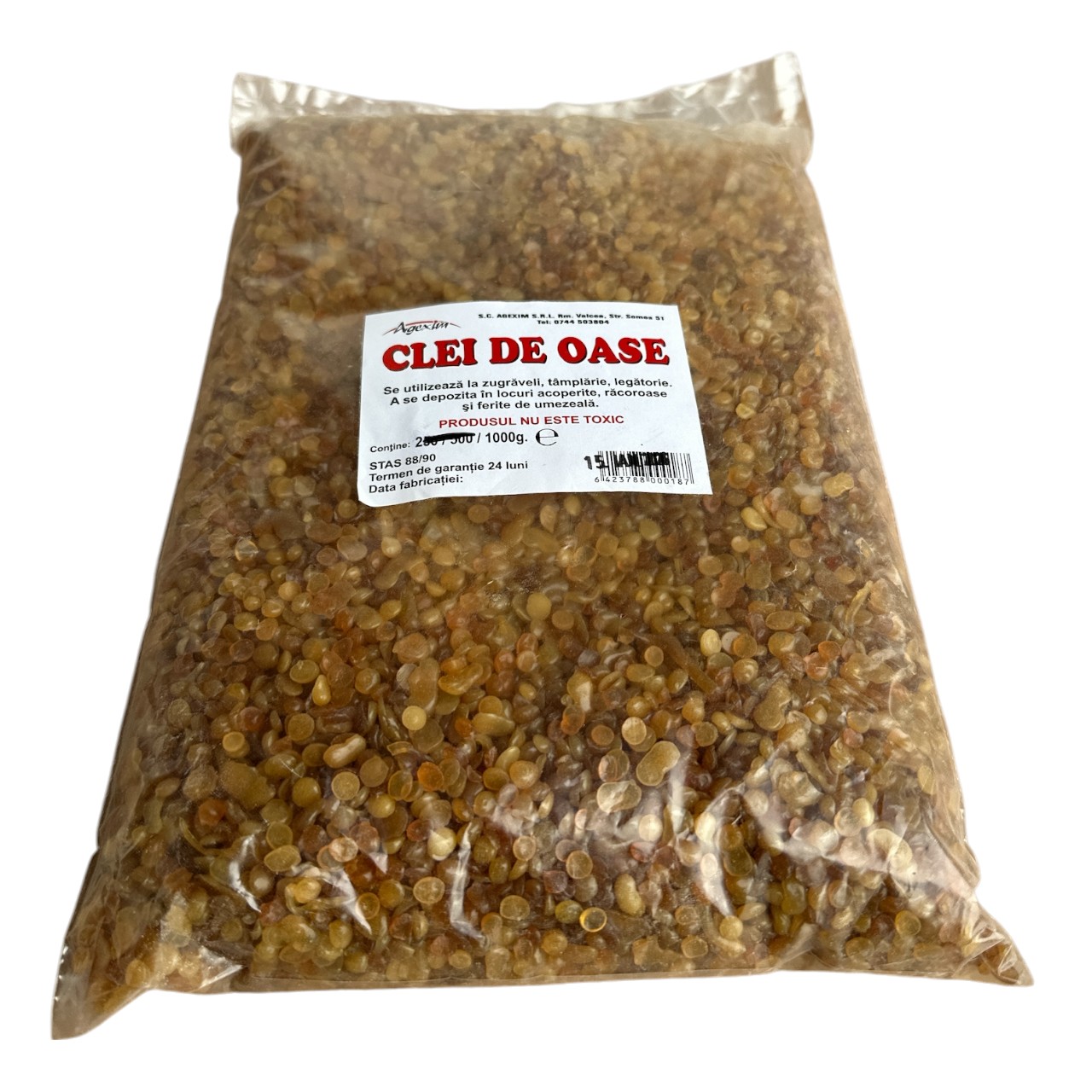 Cleiul de oase granule, ambalat în punga de 1 kg, este un lipici / adeziv fabrica prin procesul de fierbere lenta si prelungita a unor tesuturi animale. Aceste granule de clei de oase sunt rezultatul hidrolizei colagenului din piele, oase si tendoane de origine animala, formand o substanta coloidala cu proprietati adezive remarcabile. Cu aspect gelatinos, cleiul de oase granule formeaza legaturi puternice cu obiectele pe care le lipeste. Este cunoscut pentru durabilitatea sa si aderenta excelenta, fiind utilizat chiar si pentru lemn.