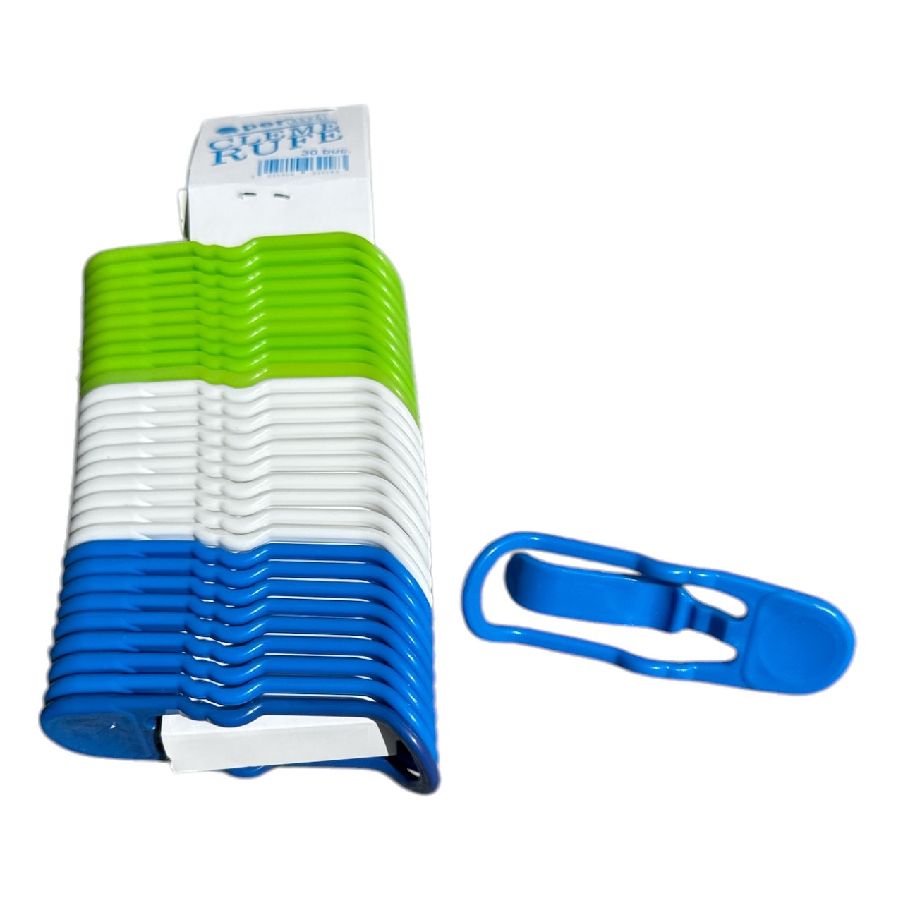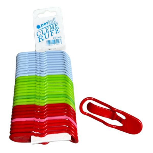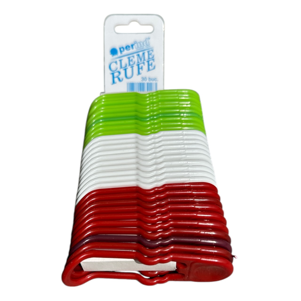 Clemele de rufe din plastic, fara arcuri in cantitate de 30 bucati sunt carlige speciale pentru sustinerea hainelor umede, atunci cand le intindeti pe sarma. Acestea sunt fabricate din plastic durificat, rezistent impotriva umiditatii, variatiilor de temperatura sau socurilor moderate. Acestea sunt excelente intr-o gospodarie, intrucat va fixeaza hainele proaspat spalate pe sarma, elimimand posibilitatea caderii lor pe jos din cauza vantului. Clemele pentru prinderea hainelor pot fi reutilizate oricand aveti nevoie si indiferent de anotimp, fara riscul deteriorarii lor.