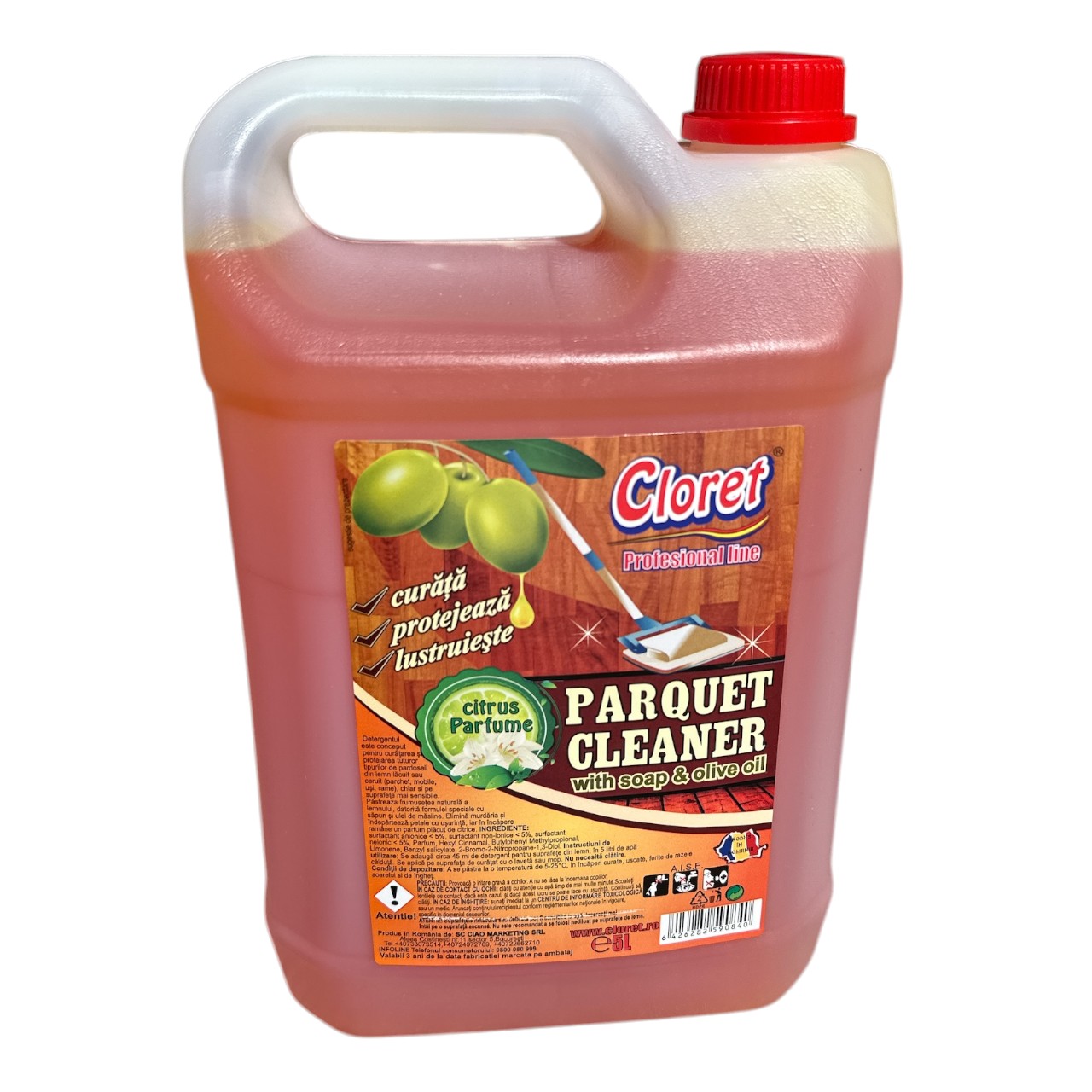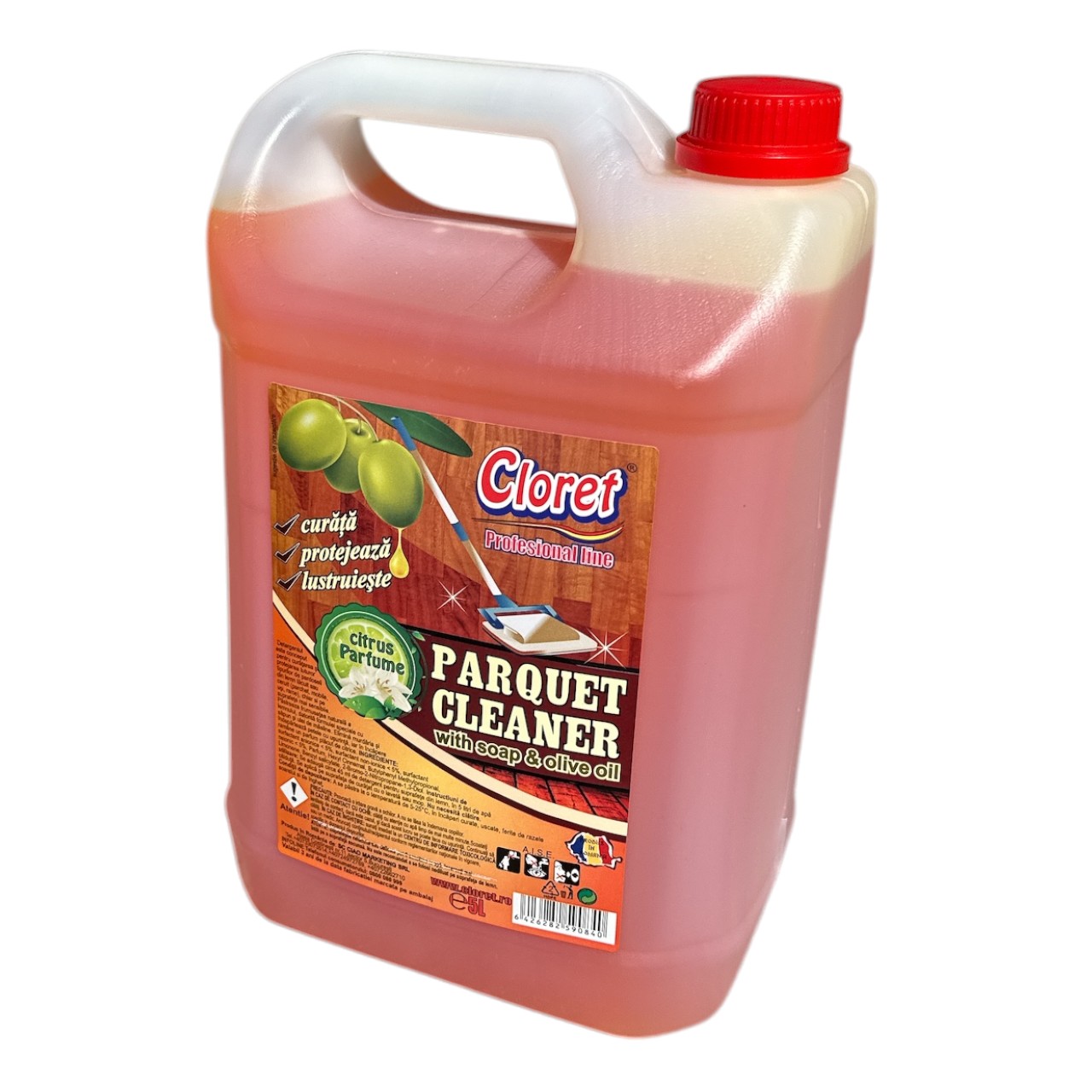 Aveti suprafete din lemn lacuit sau ceruit? Detergentul lichid pentru parchet la 5 litri de la Cloret va elimina murdaria chiar si cea persistenta. Fiind o solutie ce are la baza sapun si ulei de masline, detergentul pentru parchet curata, protejeaza si lustruieste suprafetele, invaluind incaperile intr-un parfum prosapat si persistent de citrice. Solutia pentru curatat parchetul din lemn este ambalata in recipient de 5 l, astfel ca acest produs este recomandat atat pentru curatarea parchetului, mobilei sau a usilor din lemn, aflate atat in locuinta proprie, cat si in spatiile de birouri, institutii, etc. Datorita faptului ca este un produs profesional, detergentul pentru parchet va reda stralucirea si frumusetea naturala a lemnului.