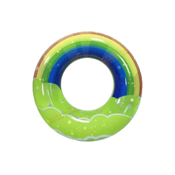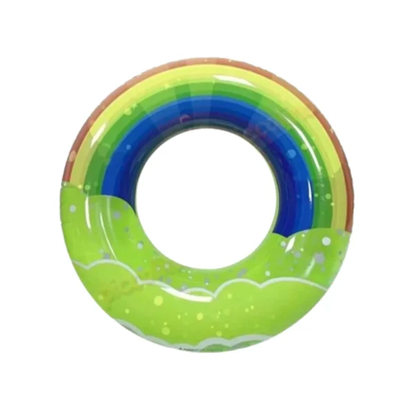 Colacul de inot gonflabil de 80 cm cu model curcubeu pe exterior este ideal atat pentru copii cat si pentru adulti. Este fabricat din Policlorura de vinil cunoscut mai bine de PVC oferind o durabilitate crescuta si rezistenta superioara la apa pentru a asigura ore intregi de distractie in piscina, in mare sau pe lac. Acesta se poate umfla utilizand o pompa de aer manuala, electrica sau pur si simplu prin suflarea orala a aerului prin supapa. Desumflarea se face prin deschiderea capacului de pe supapa. Acest proces rapid si extrem de simplu iti permite sa-l transporti si sa-l depozitezi foarte usor in orice loc disponibil atat in bagaj cat si in masina. Mai mult decat atat, are un design vibrant in culorile curcubeului ce va adauga un strop de distractie, entuziasm si bucurie copiilor.