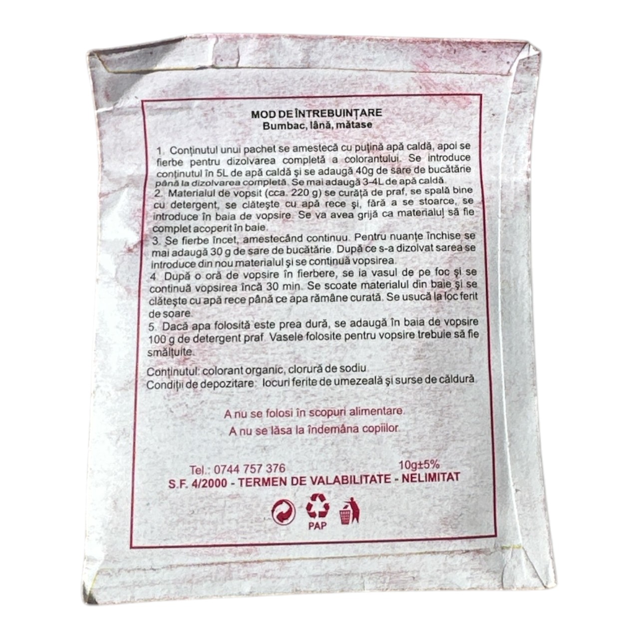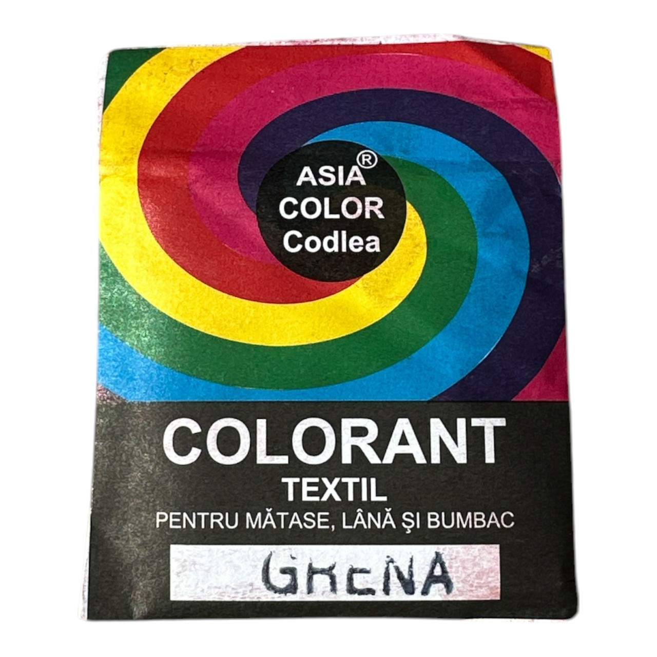 Colorant textil, Grena, 10g este un praf pentru colorat utilizat in general pe materialele din bumbac, in, matase, lana si fibre in amestec.