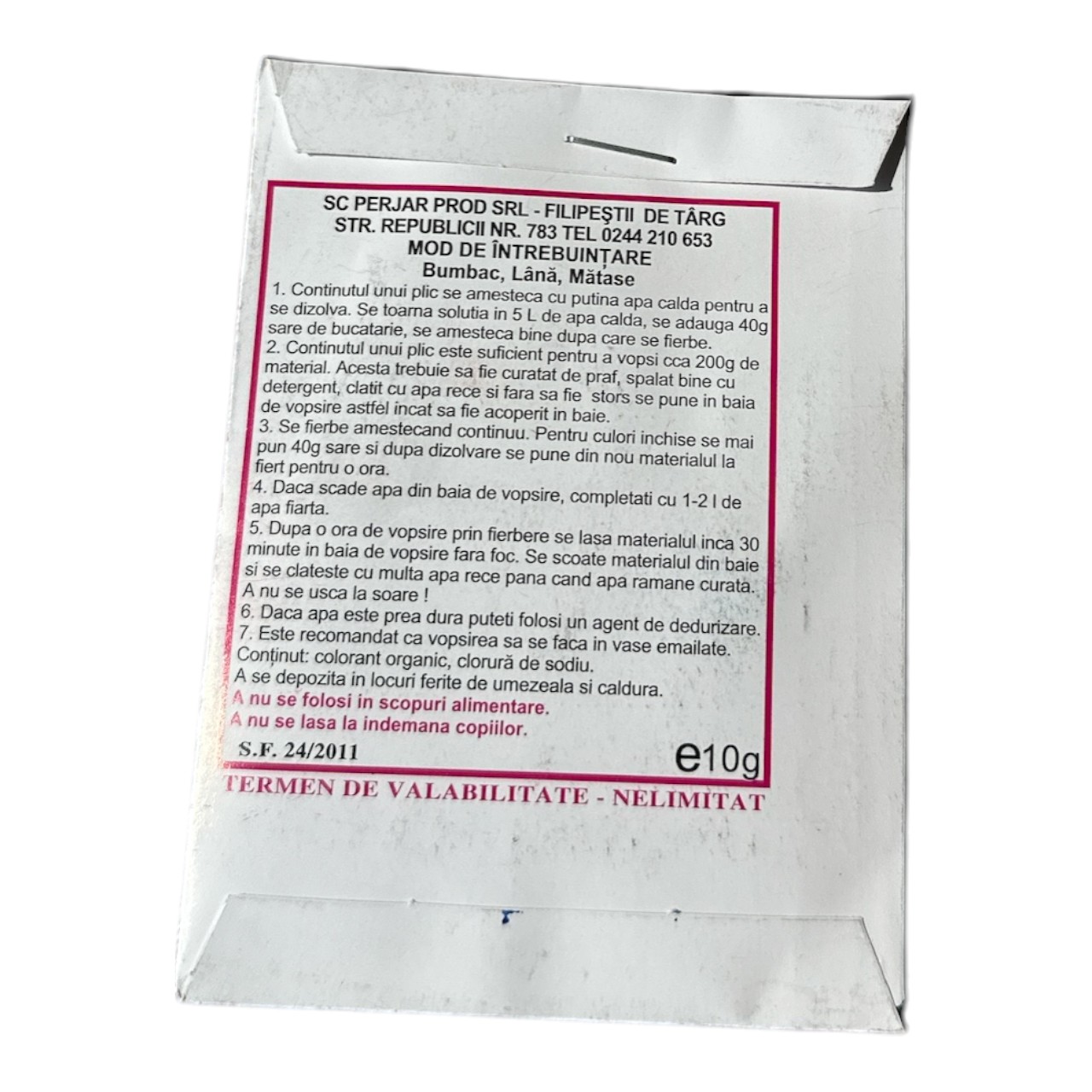 Acest colorant textil galus rosu 10g poate colora cu usurinta lana matasea si bumbacul. Continutul (pudra) plicului se amesteca cu apa calda pana se dizolva in totalitate. amestecul obtinut, se toarna intr-un total de 5 litri de apa incalzita si se adauga 40 de grame de sare iodata, in timp ce se amesteca foarte pana fierbe. Continutul unui singur plic, este indeajuns pentru vopsirea a cca 200 de grame de textile. Materialul ce urmeaza a fi vopsit, trebuie curatat bine cu detergent si clatit cu apa rece, dup care e introduce in solutia obtinuta pentru vopsire, si se amesteca in timp ce este pe foc, pana incepe sa fierba