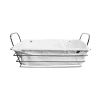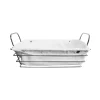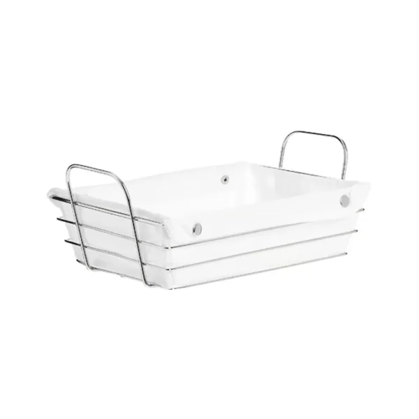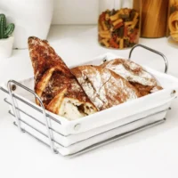 Cosul de paine din inox cu interior textil, in forma dreptunghiulara avand dimensiunile de 26x19x8 cm, reprezinta o solutie eleganta pentru amplasarea si pastrarea painii sau a produselor de patiserie pe masa. Materialul textil din interior este fixat cu capse de structura cosului si are rolul de a preveni caderea firimiturilor pe masa sau pe jos. Designul sau modern si aspectul lucios al structurii din inox adauga un plus de eleganta oricarei bucatarii sau mese. Cosul de paine din inox este perfect pentru pastrarea feliilor de paine, covrigi, gogosi, pateuri cu branza sau alte produse de patiserie. De asemnea, este potrivit atat pentru uz casnic, cat si pentru mediul profesional, cum ar fi in restaurante, cantine sau cafenele.