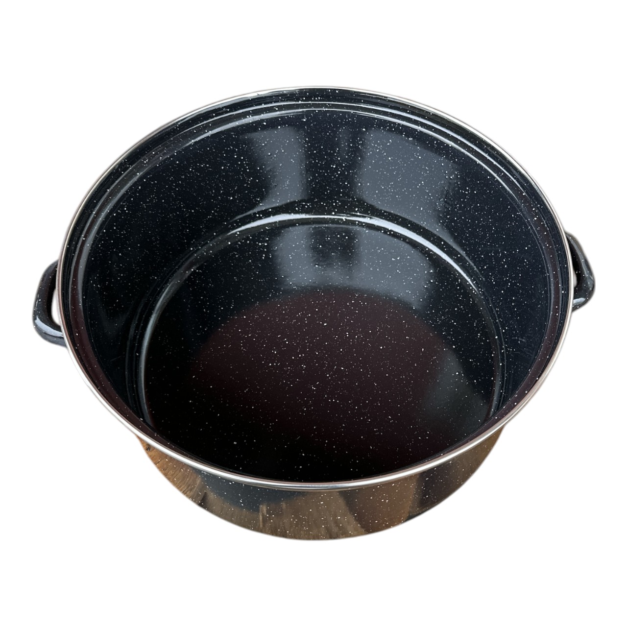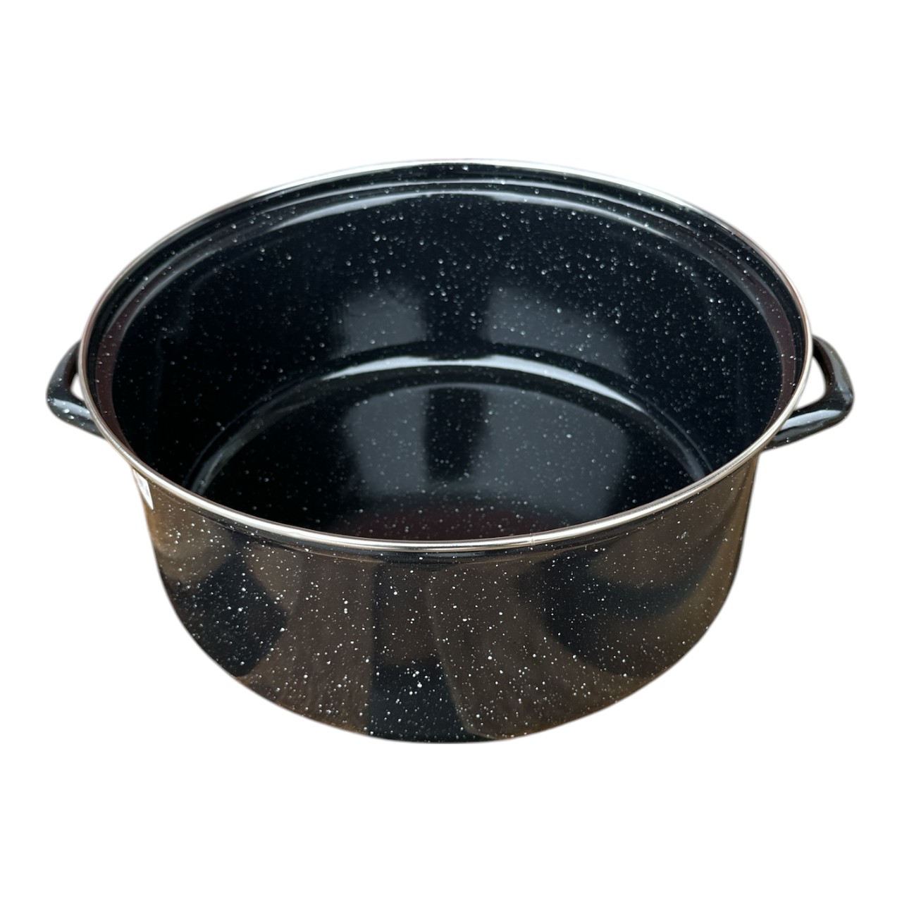 Cratita emailata cu un volum de 18 L si culoare neagra este produsul esential pentru bucataria dumneavoastra atunci cand este nevoie de un vas mai mare pentru satisfacerea poftelor culinare a intregii familii. Cratita emailata cu 18 L capacitate este un accesoriu pentru gatit indispensabil din bucataria pasionatilor din domeniul gastronomiei. Mai mult decat atat, Cratita emailata de 18L vine prevazuta cu margine cromata si manere atasate simetric de peretii laterali ce permite ca transportul si manevrarea sa fie in conditii de siguranta. Cratita de 18 l emailata este excelenta pentru prepararea diferitelor bucate traditionale precum ciorba, sarmale, ardei umpluti sau parjoale, putand fi folosita pe aragaz, in cuptor sau la foc afara in aer liber.