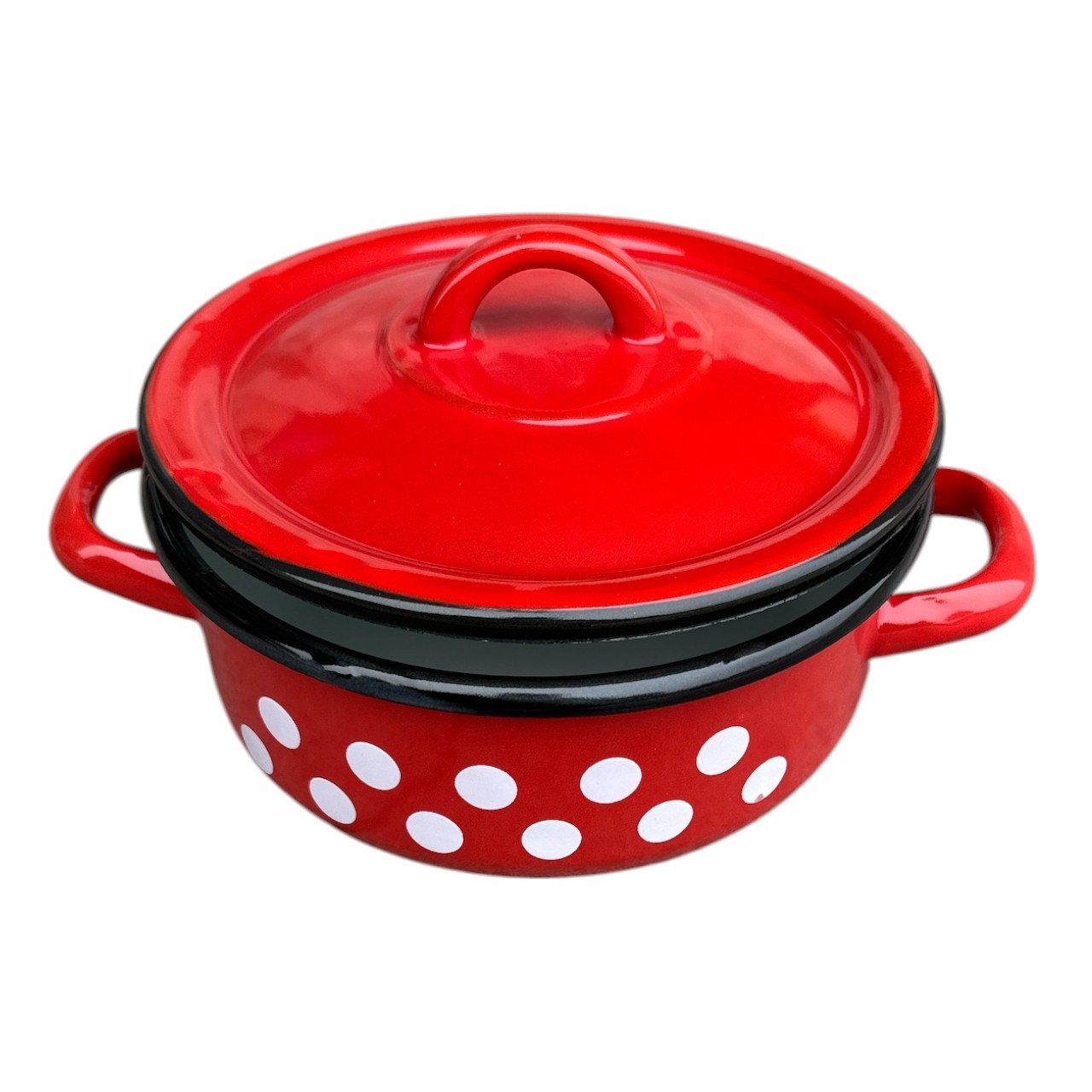 Cratita emailata rosie de 3 litri echipata cu manere pe laterale si capac are un strat de email pe suprafata ei, asigurand rezistenta mecanica superioara, nu lasa bacteriile sa se dezvolte, nu se ciobeste si nu se zgarie. In aceasta cratita se pot prepara absolut orice fel de mancaruri, multumita caracteristicilor sale. De asemenea, emailul ii ofera cratitei un aspect deosebit de fin si lucios. Totodata cratita se utilizeaza pe orice fel de sursa de caldura (aragaz, plita, pe jar sau carbuni incinsi).