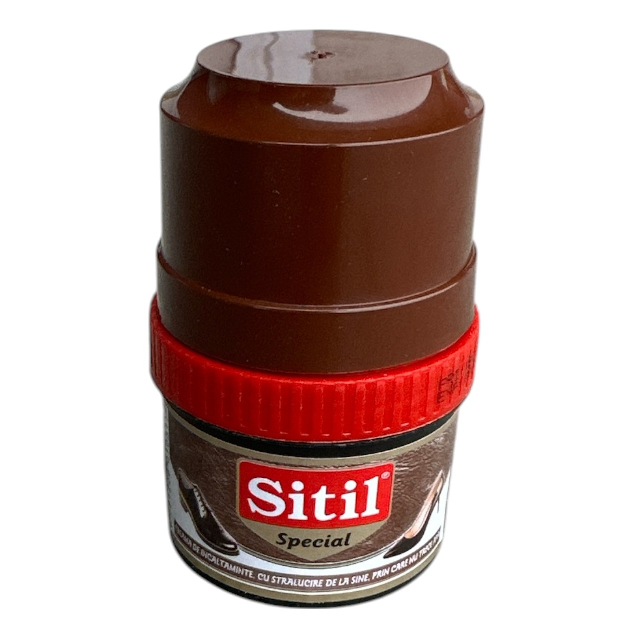 Crema pantofi cu burete 60 ml este o crema de pantofi solida, de culoare maro pentru incaltamintea din piele. Pentru aplicarea produsului se foloseste buretele special. Se ia cu buretele o cantitate mica de crema apoi intindeti uniform pe incaltaminte crema. Produsul are efect imediat si nu necesita uscare.