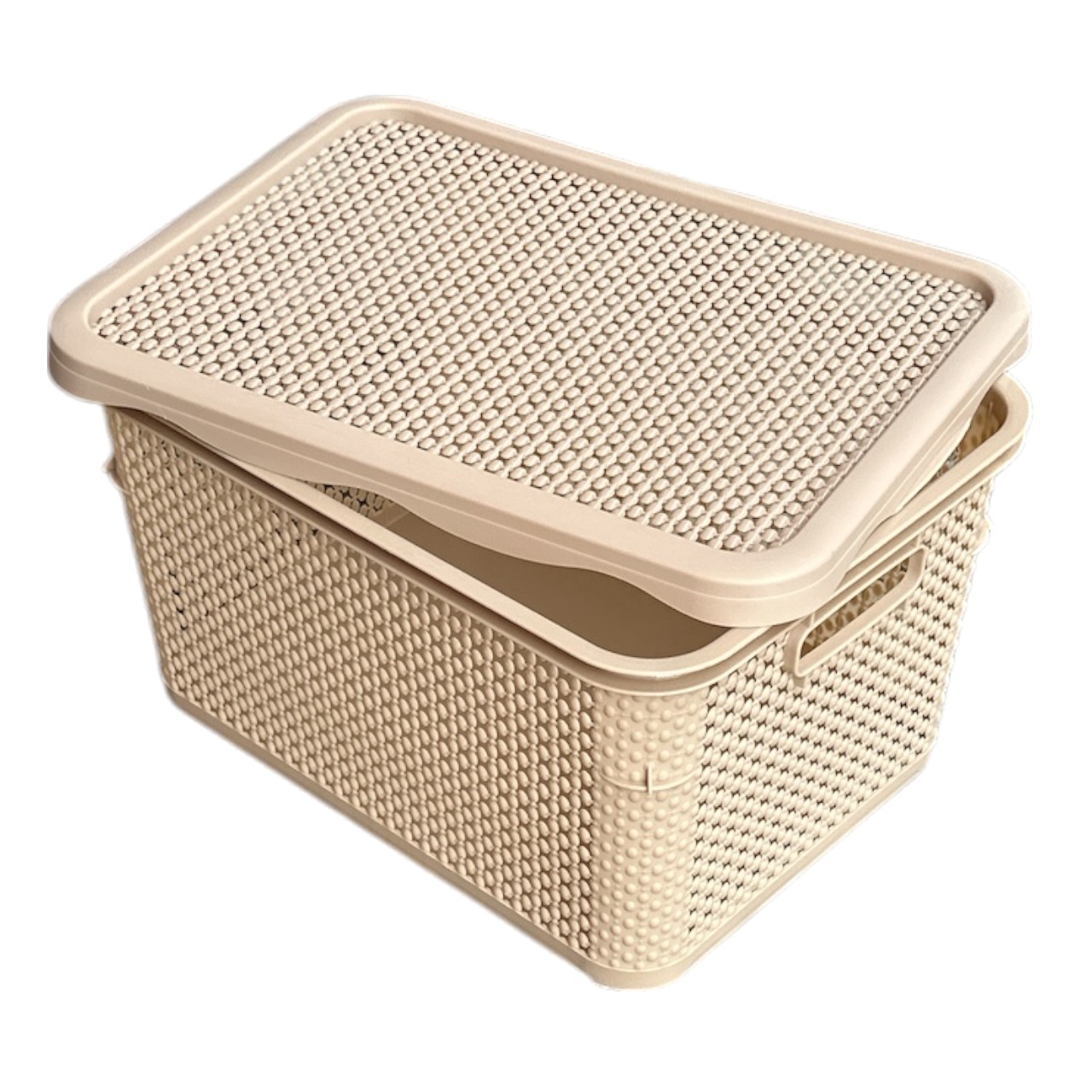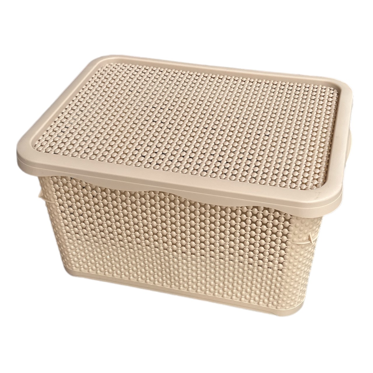 Cutia de depozitare din plastic cu capac, de 40 litri are suprafata cu model perlat de culoare bej, este fabricata din polipropilena in forma dreptunghiulara si poate fi utilizata pentru organizarea sau depozitarea diverselor obiecte cum ar fi: jucariile, ustensile usoare, unelte, carti sau chiar hainele. Aceasta cutie din plastic de depozitare are mici orificii printre modelul cu perle, permitand aerului sa circule si sa ajunga in interior. Capacul din dotare completeaza cutia, acoperint obiectele din interior. Cutia de depozitare cu capac de 40 l este usor de manevrat intrucat are manere inglobate pe laterale. Poate fi depozitata in diverse incaperi, precum dormitorul, sufrageria sau garajul, pentru a va mentine lucrurile organizate si la indemana.
