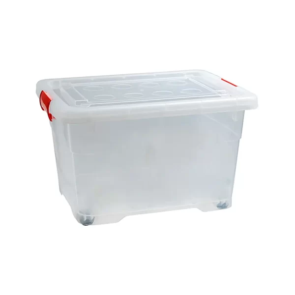 Cutia de depozitare din plastic cu roti si capac avand o capacitate de 50l, ofera un spatiu de depozitare practic, accesibil si clar datorita transparentei sale, pentru haine, jucariile copiilor, diverse alimente cum ar fi legumele si fructele, echipamente de lucru / sportive (salopete, manusi) unelte usoare utile in gradina, accesorii de birou sau produse de intretinere si igiena in baie. Design-ul special cu roti permite mutarea usoara a cutiei din plastic pe suprafete denivelate, mochete, covoare, etc. Fabricata din polietilena de inalta densitate (HDPE) a fost realizata sa dureze in timp si sa reziste uzul intens, socuri de impact, umiditate si schimbari de temperatura.