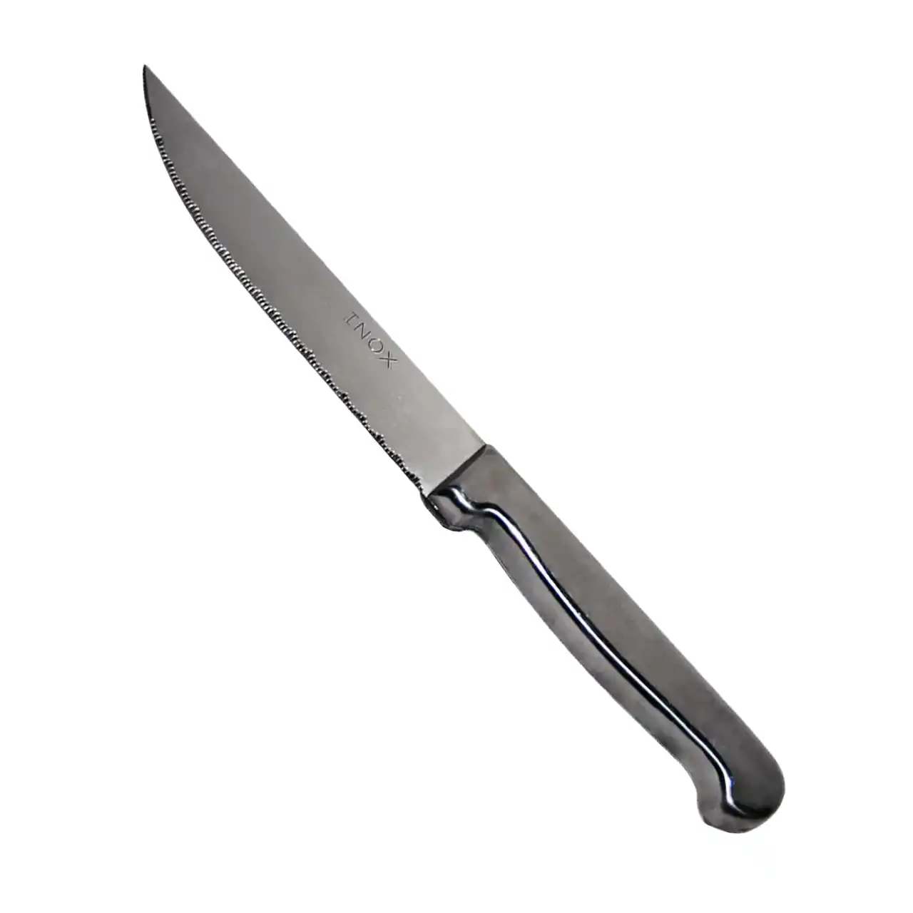 Cutitul din inox cu lama zimtata este universal in utilizare, are lama lunga de 11.5 cm si maner ergonomic. Acesta se foloseste in general pentru taierea usoara a legumelor, fructelor, painii, fripturii sau blaturilor, precum cel de pizza. Cutitul din inox este foarte durabil multumita materialului, zimtii nu se tocesc usor, iar manerul confera confortabilitate mainii si o prindere ferma, astfel incat sa il folositi in siguranta. Un astfel de cutit inox, zimtat este perfect atat in propria bucatarie cat si in cele profesionale din restaurante fast-food, pizzerii etc. datorita calitatii lamei si rezistentei sale la tocire.