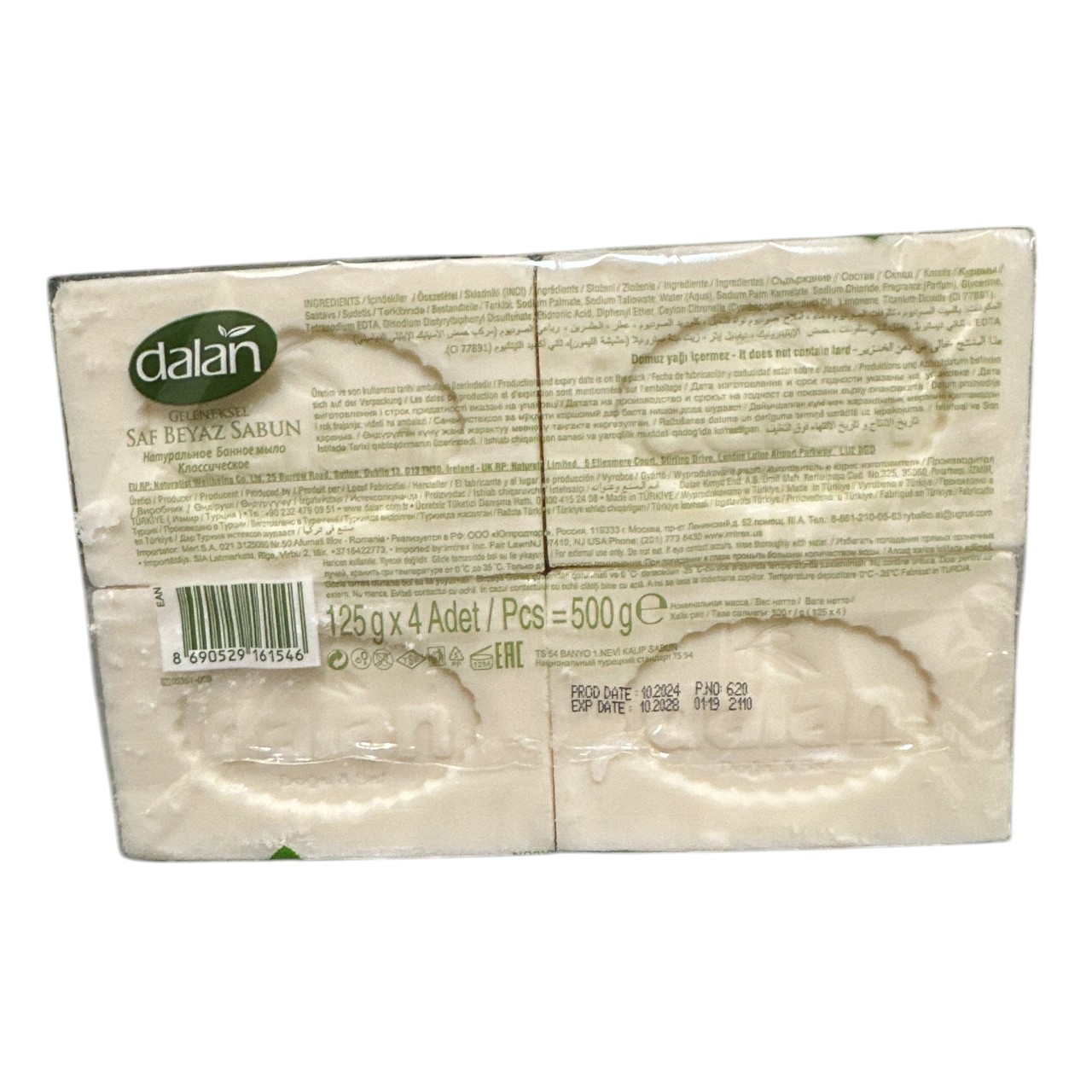 Sapunul de rufe solid Dalan de 125 g ce vine la set de 4 bucati este un produs traditional cu parfum placut ce contine ingrediente puternice pentru o spalare manuala temeinica a tuturor rufelor. Sapunul de rufe solid Dalan de 125 g se poate folosit fara nici un fel de problema atat in apa calda cat si apa rece, indiferent ca spalati la mana sau in masina de spalat (razuind sapunul). Dalan sapun rufe solid este excelent nu numai pentru rufe, ci si pentru spalarea mainilor sau a intregului corp, fara sa intampinati probleme dermatologice sau orice alt disconfort. Sapunul Dalan de rufe trebuie ferit atat de zonele umede, lumina puternica a soarelui cat si de indemanarea celor mici.