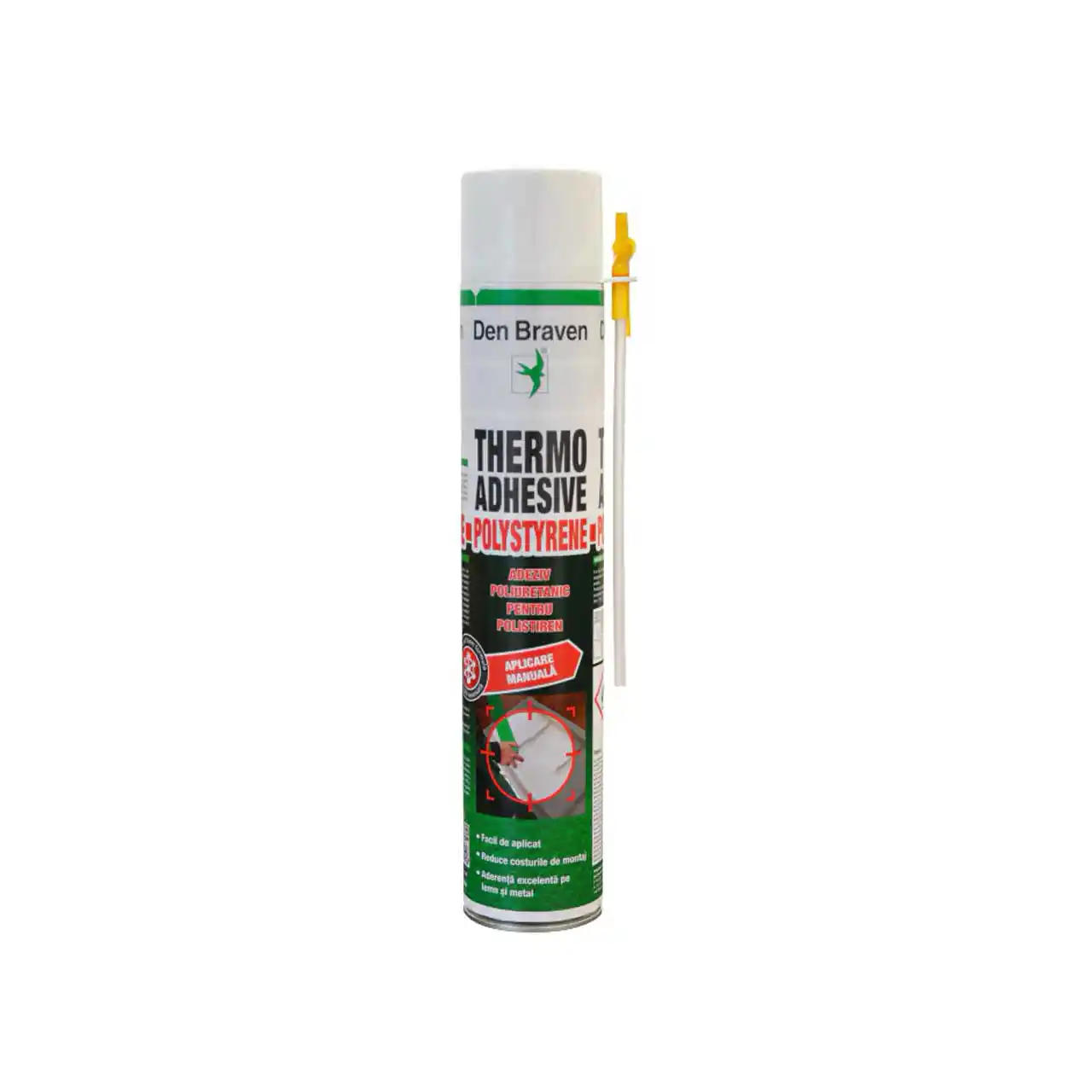 Adezivul spuma in cantitate de 700ml de la Den Braven este un adeziv poliuretanic special fabricat pentru a lipi placile de polistiren pe diverse suprafete precum cele din lemn, BCA, caramida, metal, tencuiala. Den Braven polistiren este un adeziv monocomponent ce are proprietatea de a se intari chiar si in conditii de umezeala sau temperaturi ridicate de +35°C, devenind apoi foarte elastic si de o rezistenta deosebita. Adezivul Den Braven pentru polistiren cu aplicare manuala, face parte din categoria adezivilor termici, astfel ca multumita formulei avansate ce sta la baza acestui adeziv spuma vor fi stopate atat transferul termic, infiltratiile de apa, cat si pierderile de aer. Aceasta spuma poliuretanica de la Den Braven se poate vopsi, acoperi cu ipsos, tencuiala sau chit si nu este recomandata pentru a lipi polistiren de suprafete din plastic, polipropilena, neopren, bituminoase, etc.