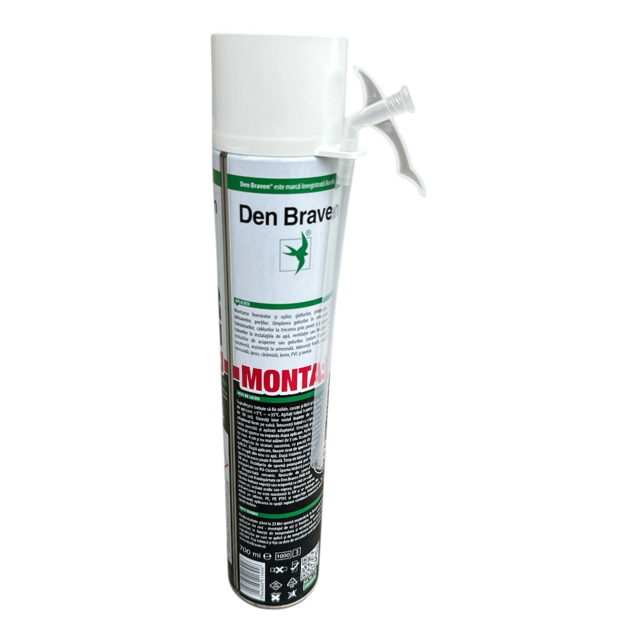 Spuma poliuretanica Den Braven 700ml este un material tip spuma, remarcabil si versatil, ce nu are nevoie de fixare mecanica sau aditivi speciali de lipire. Spuma previne dezvoltarea bacteriilor si ciupercilor, prezinta o rezistenta superioara la atacul insectelor si rozatoarelor. Produsul rezista excelent la umiditate, baze si acizi, precum uleiurile diluate, diluanti, si solventi.Spuma poliuretanica Den Braven 700ml adera excelent pe tencuiala, ipsos, beton, caramida, PVC sau lemn, fiind ideala pentru montarea ferestrelor, usilor, glafurilor, pragurilor, obloanelor, pentru umplerea golurilor in lucrari de constructii, pentru izolarea tubulaturilor, cablurilor la trecerea prin plafoane si pereti. Acesta etanseaza foarte bine rosturile, izoland fonic si termic.