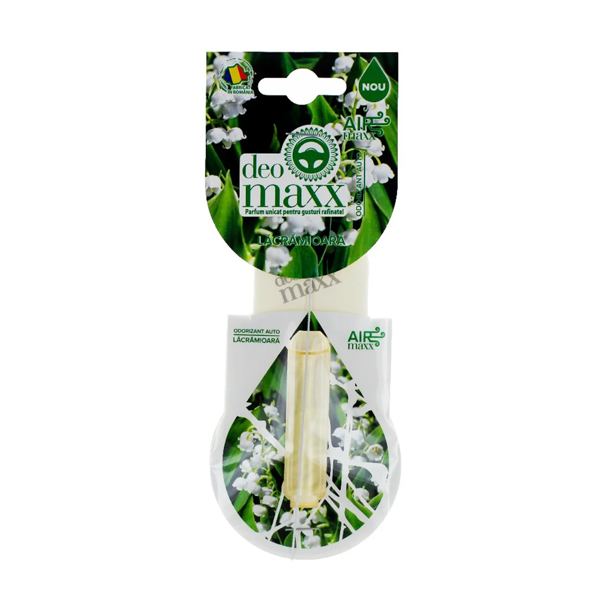 Odorizantul auto Deo Maxx cu parfum de lacramioara ambalat la fiola de 5 ml iti va transforma interiorul autoturismului intr-o gradina parfumata intens. Odorizantul de numai 5 ml contine agenti neutralizanti care nu doar acopera ci inlatura orice alt miros neplacut, cum ar fi: cel de fum de tigara, aer inchis sau mancare. Parfumul intens de lacramioare va alinta simturile oricarei doamne sau domnisoare care doresc un aer proaspat floral in interiorul masinii indiferenta ca fac o plimbare scurta sau o calatorie lunga. Totodata, odorizantul Deo Maxx cu lacramioare este alcatuit din o fiola plina cu lichid odorizant si un cartonas special care, odata sparta fiola se imbiba cu parfum, eliberandu-l treptat in autoturism. Pentru o intensitate mai mare puteti agata odorizantul in fata sistemelor de ventilare a aerului.
