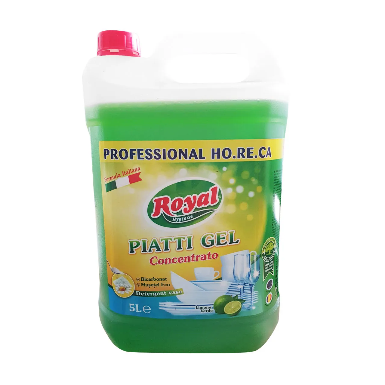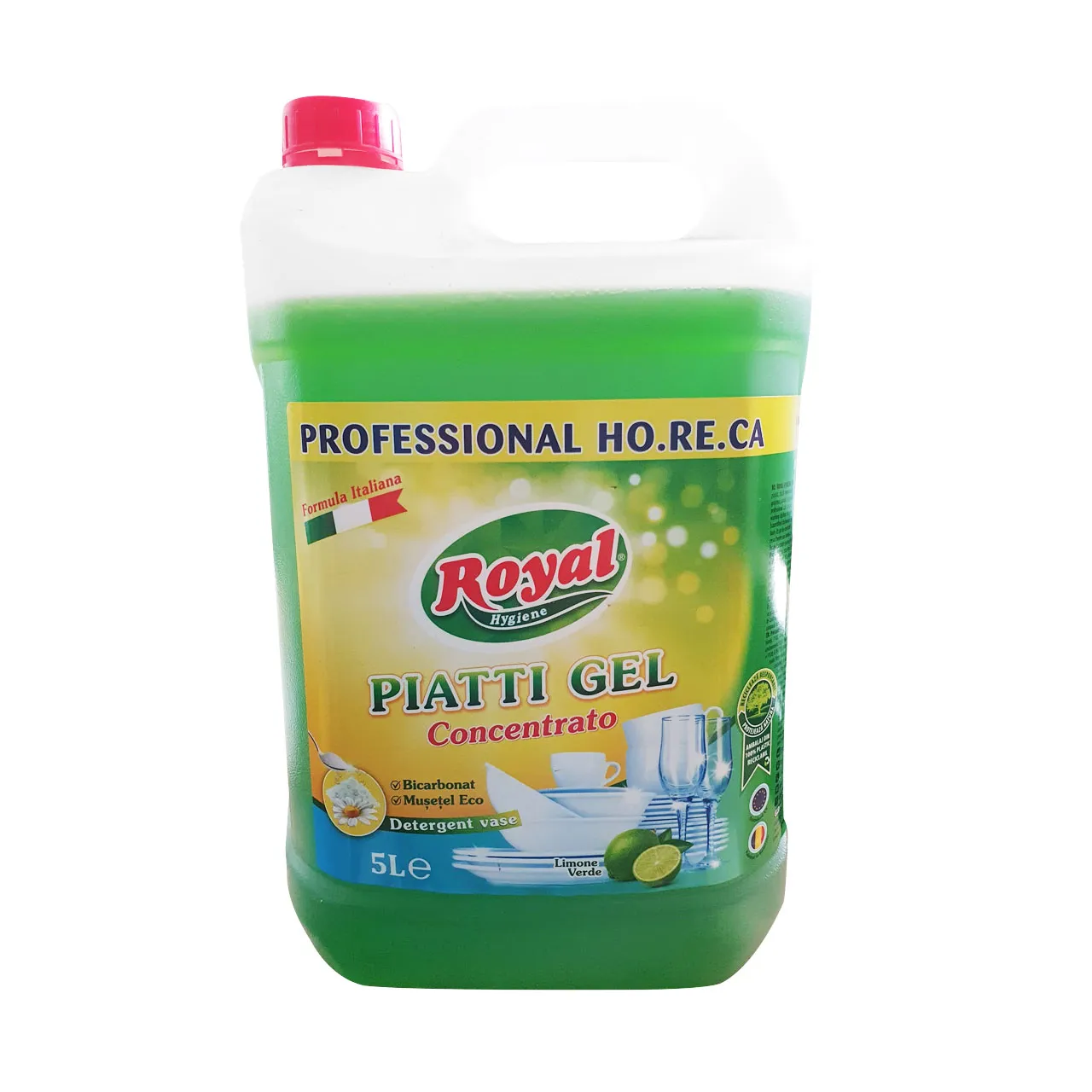 Detergentul de vase cu bicarbonat, musetet si parfum de lamaie verde in cantitate de 5 litri este un produs tip gel farte concentrat utilizat pentru indepartarea oricarui tip de grasime, (incluziv cea arsa) cruste intarite, mancare uscata si murdarie de pe vasele de gatit sau servit (farfurii, platouri, tavi etc). Detergentul pentru vase Royal cu bicarbonat si musetel este un degresant extrem de puternic, intrucat are o mare putere de curatare si parfumeaza placut vasele cu aroma sa intensa de lime (lamaie verde). Folosind Acest tip de detergent vase Royal va fi necesara doar una doua picaturi de gel concentrat pentru a curata eficient orice vas ceramic emailat, inox, tava, tigaie teflonata, sticla termorezistenta, plastic sau lemn.