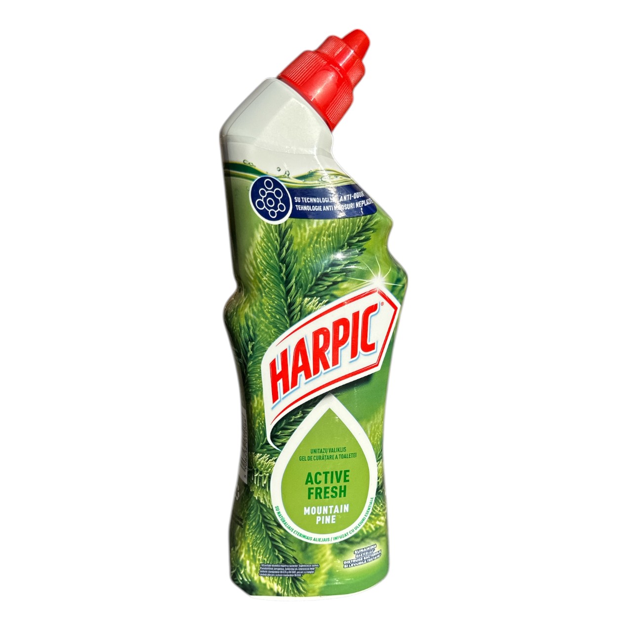 Dezinfectant WC Harpic Active Fresh Pine, 750 ml este o solutie lichida sub forma de gel ce are puterea de a curata si igieniza vasul de toaleta. Multumita formulei sale active, Dezinfectant WC Harpic Active Fresh Pine elimina pana la 99.9% din bacteriile ce se depun pe vasul de toaleta, improspatand incaperea cu un parfum puternic si proaspat de padure, ce va persista mult timp. In plus, dezinfectant toaleta Harpic Active Fresh Pine la 750ml va inlatura petele si depunerile de piatra inca de la prima utilizare. Datorita formei recipientului si a consistentei sale, Harpic WC gel poate patrunde in spatiile greu accesibile (sub rama vasului de toaleta), eliminand solutia dezinfectanta ce va actiona timp de 24 ore de la aplicare.