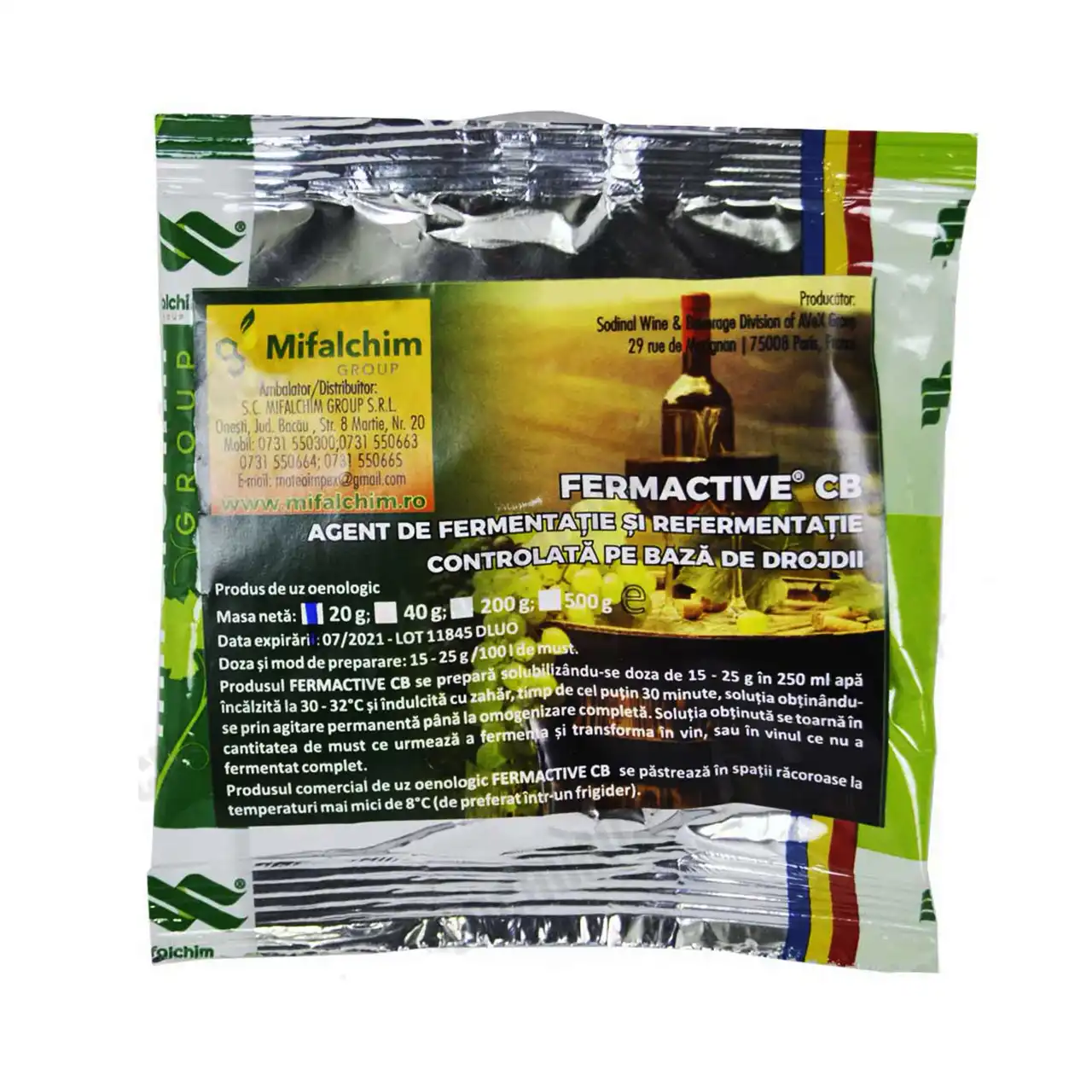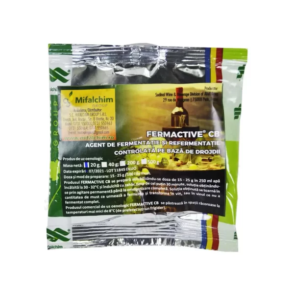 Se adauga 15-20 g de Fermactive CB in 250ml apa cu o temperatura de 30ºC, indulcita si se agita timp de 30 minute pana se omogenizeaza. Continutul se adauga peste must sau vinul ce nu a fermetat suficient.