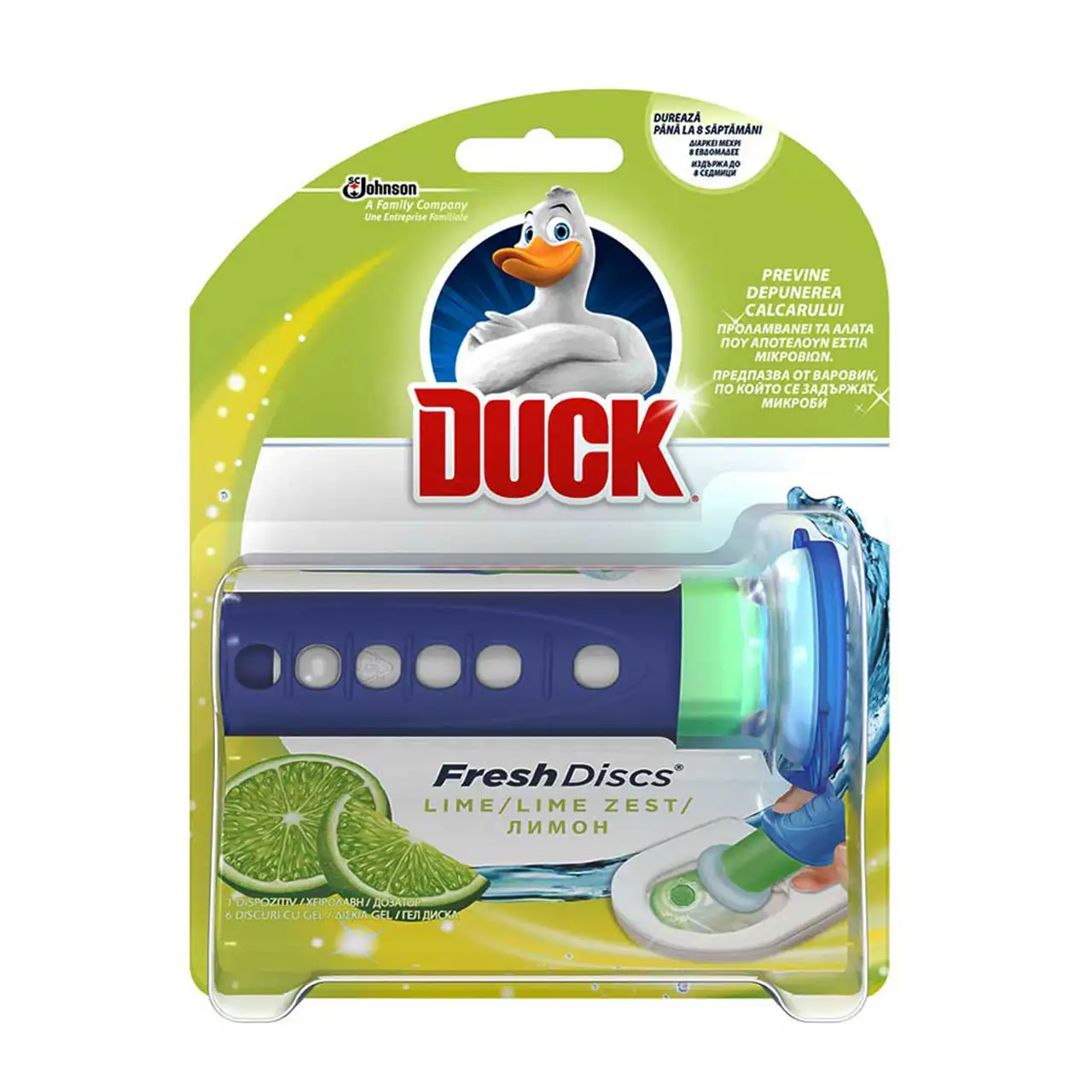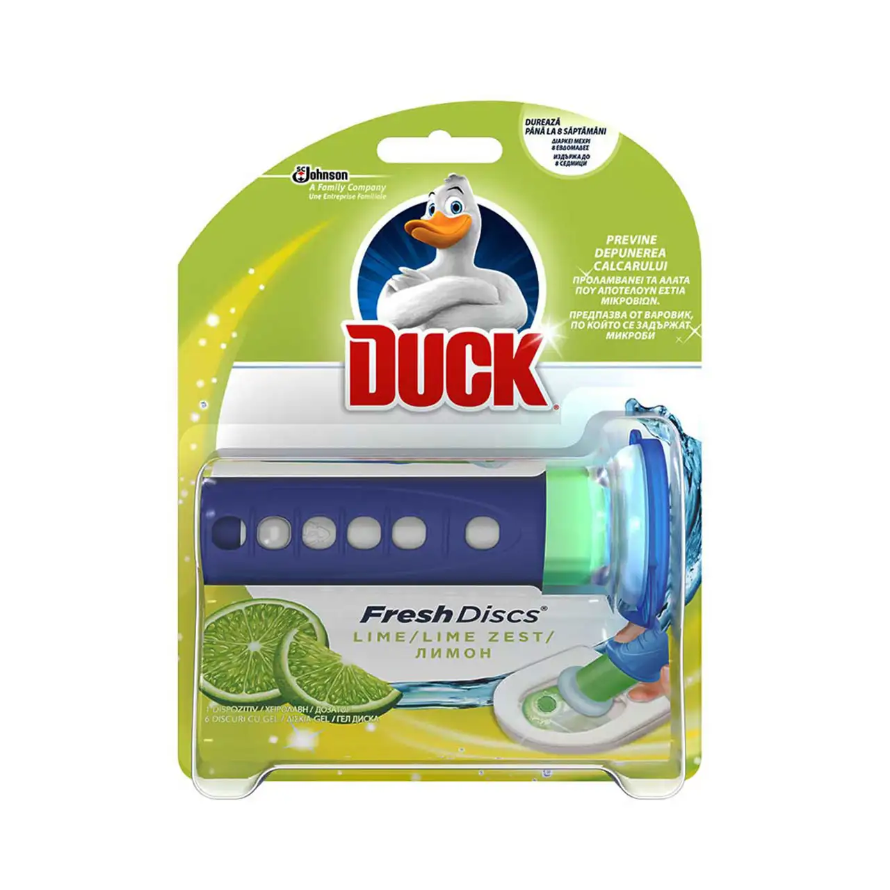 Odorizantul de WC gel Duck Fresh Discs lime (lamaie) in cantaitate de 36 ml va ofera curatare, protectie si parfum poaspat de lamaie vasului de toaleta de fiecare data cand trageti apa. Odorizantul de WC gel Duck Fresh Discs Lime ofera 6 discuri care se lipesc pe suprafata interioara a toaletei multumita recipientului special creat pentru a facilita acest lucru. Duck Fresh Discs Lime este un odorizant de WC gel ce persista pana la 9 zile in functie de numarul de utilizari a toaletei. Aplicarea odorizantului de WC Fresh Discs Duck lime se face intr-un mod igienic fara sa mai fie necesara atingerea vasului de toaleta.