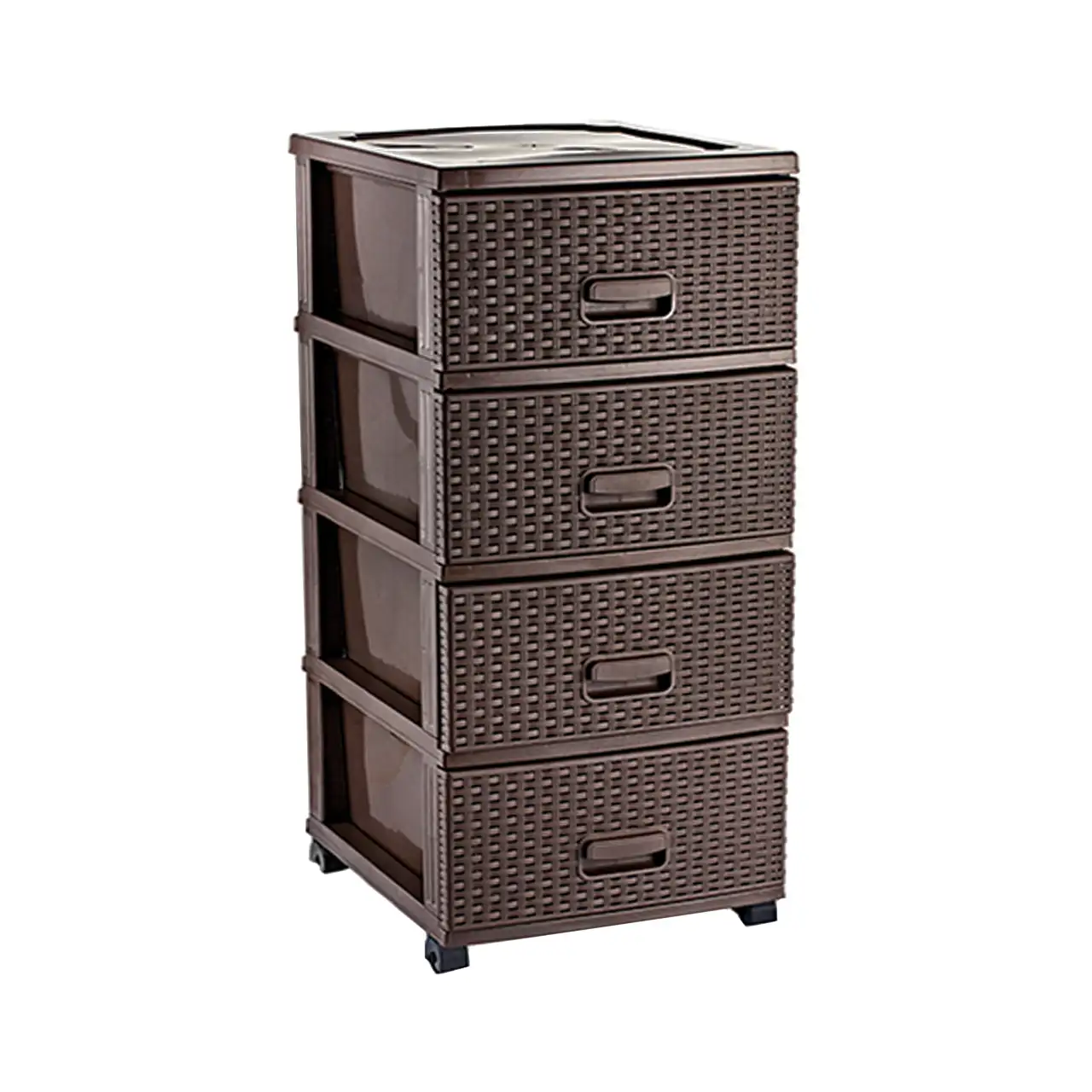 Dulapul de plastic cu 4 sertare ratan (imitatie) de culoare maro este un produs universal pentru depozitare, intrucat il puteti utiliza in baie, bucatarie, balcon sau dormitor. In acest fel, veti depozita obiecte si ustensile de bucatarie, unelte casnice sau chiar si haine, avand posibilitatea sa le sortati corespunzator. Modelul maro de dulap plastic cu sertare este un produs turcesc, prelucrat din plastic (polipropilena) dura, capabil sa reziste la uzura, modificari de temperatura sau socuri. Dulapul cu sertare din plastic maro marca Alkansan are dimensiuni compacte si greutate redusa, astfel incat sa il puteti amplasa foarte usor in orice loc disponibil.