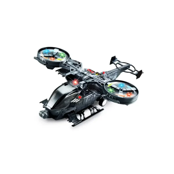 Elicopterul de lupta din plastic dotat cu 2 rotoare laterale de culoare negru este o jucarie special creata pentru baietii cu varste de 3, 4, 5 sau 6 ani. Acesta este prevazut si cu sunete foarte aproape de realitate si lumini vibrante, astfel incat sa capteze atentia oricarui copil atunci cand se jaoca cu el. In plus, Elicopterul de lupta este fabricat din plastic durabil, rezistent la socuri si uz repetat. Cele 2 rotoare se pot detasa pentru a putea fi curatate usor, fara sa fie deteriorate. Elicopterul cu 2 rotoare functioneaza cu 3 baterii AA de 1.5 V.