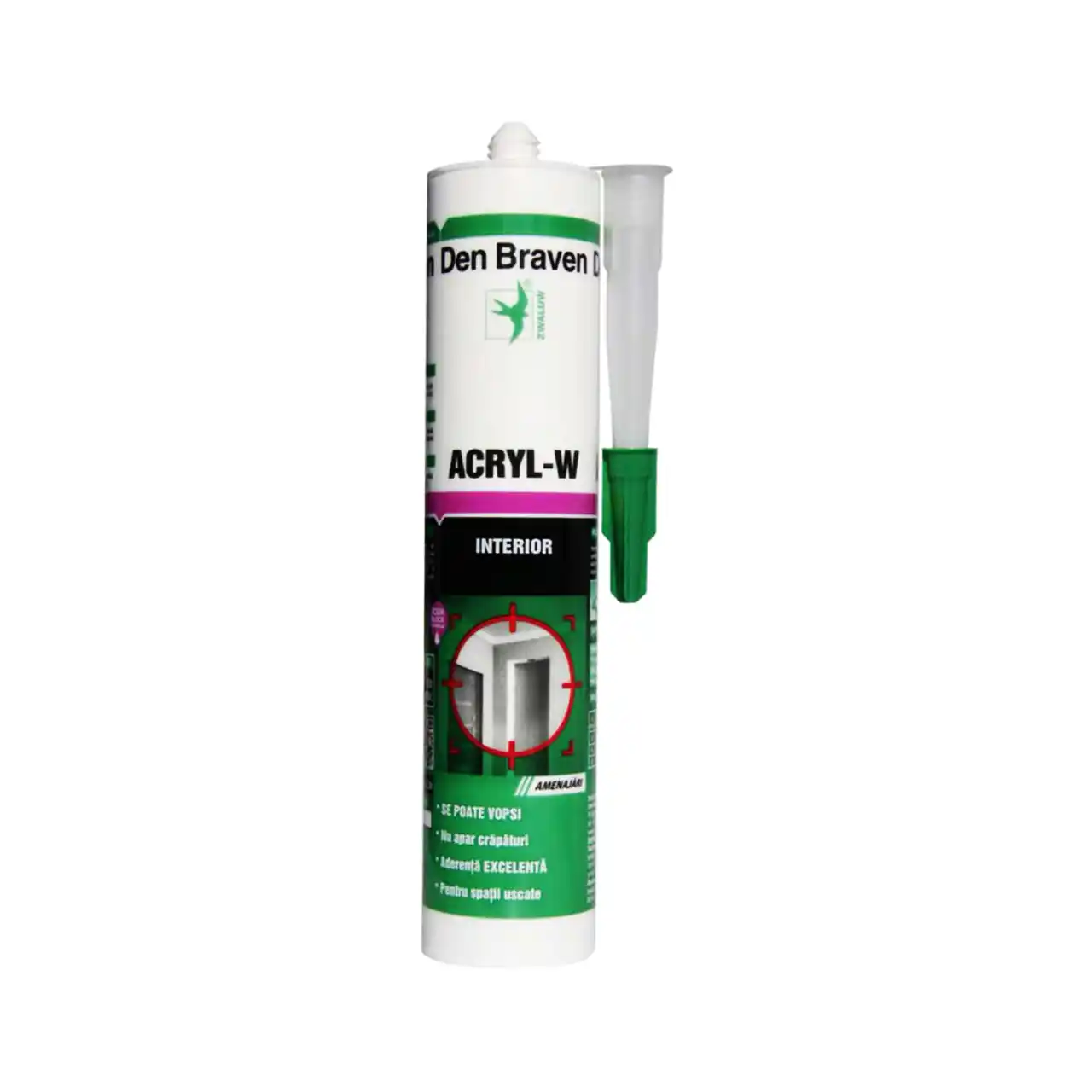 Modalitate de utilizare Den Braven Acryl W: Suprafetele trebuie sa fie curatate, uscate si fara grasimi, se finiseaza cu o spatula umezita in solutie neutra de apa si sapun, in maxim 10 minute de la aplicare. Se poate vopsi dupa intarire. Doar pentru spatii uscate.