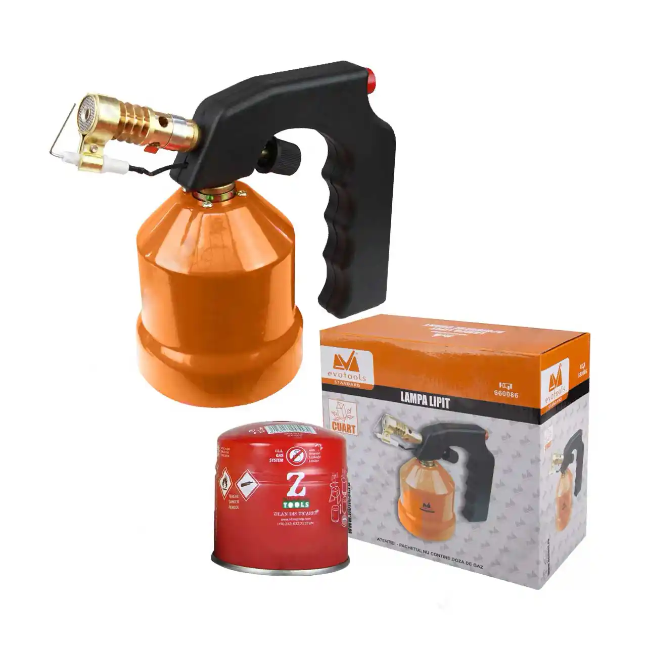 Lampa Evotools este una metalica folosita pentru sudura (lipirea) in cupru ce vine dotata cu aprindere pe quart (cuart) si reglaj simplu de intensitate a flacarii, va fi de mare folos pentru specialistii in instalatiile realizate din tevi de cupru. Lampa de sudura Evotools este prelucrata din foaie metalica groasa ce protejeaza foarte bine doza de gaz de eventualele lovituri sau alte accidente neplacute. Cu lampa de gaz Evotools veti executa lipiri de orice fel sau veti dezlipi compenentele intepenite din cauza vopselei imbatranite. Lampa de sudura metalica pentru lipirea cuprului a fost construita sa poata rezista pe o perioada lunga de timp cu un minim de intretinere. De asemenea, Lapa de gaz Evotools vine impreuna cu o doza de gaz.
