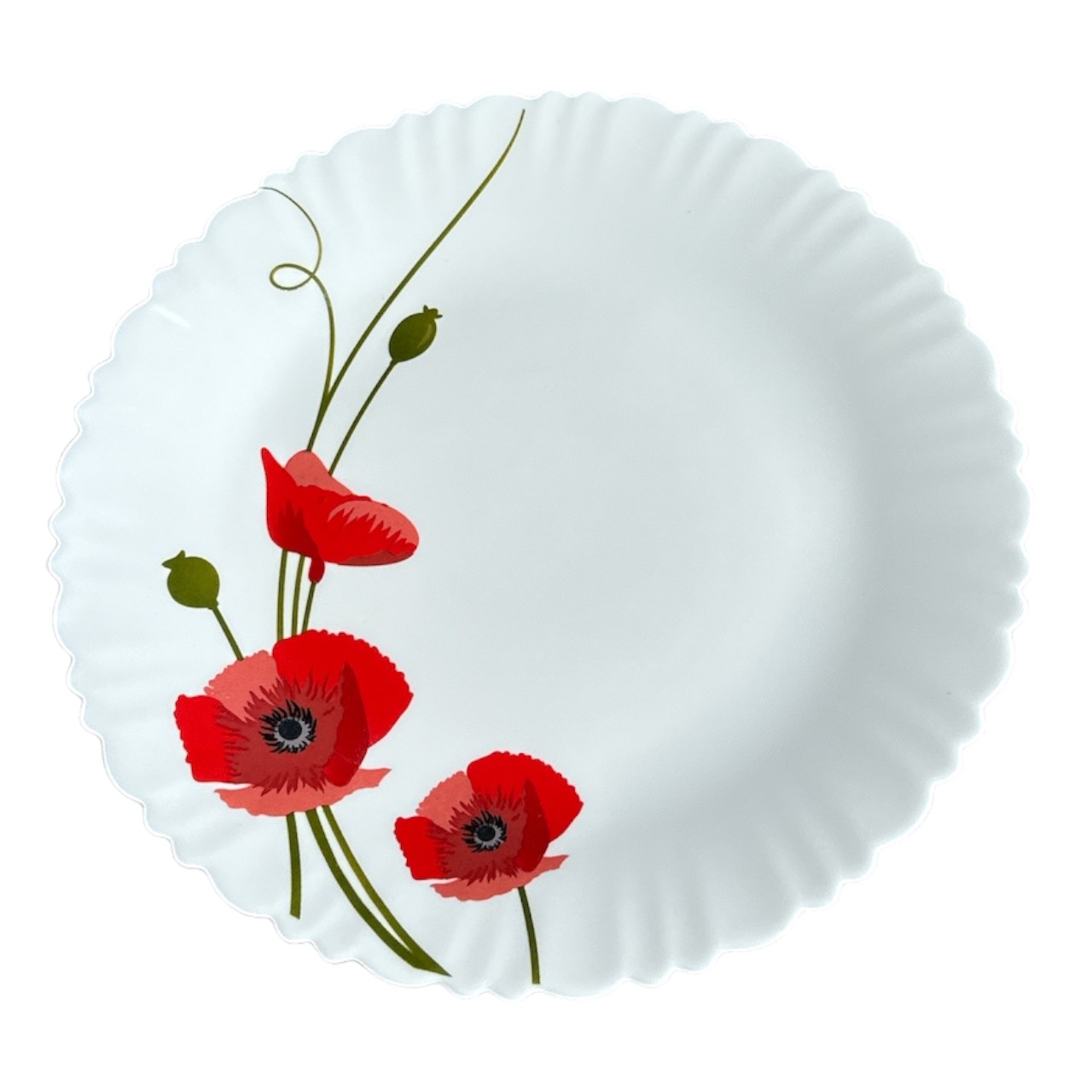 Farfuria intinda din opal avand model de flori de maci rosii cu diametrul de 26 cm este un vas de servit mancare foarte rezistent la socuri mecanice moderate, zgarieturi sau socuri termice. Conceputa pentru utilizarile zilnice si repetate, farfuria opal intinsa poate fi utilizata cu succes in mod profesional pentru servirea clientilor intr-un restaurant, cantina sau alt local care prepara mancare. In plus, comparativ cu tipuri de materiale precum ceramica, opalul este mult mai usor, asigurand o manipulare mult mai comoda. De asemenea, are suprafata neteda si lucioasa, iar marginile sunt placut modelate in valuri.